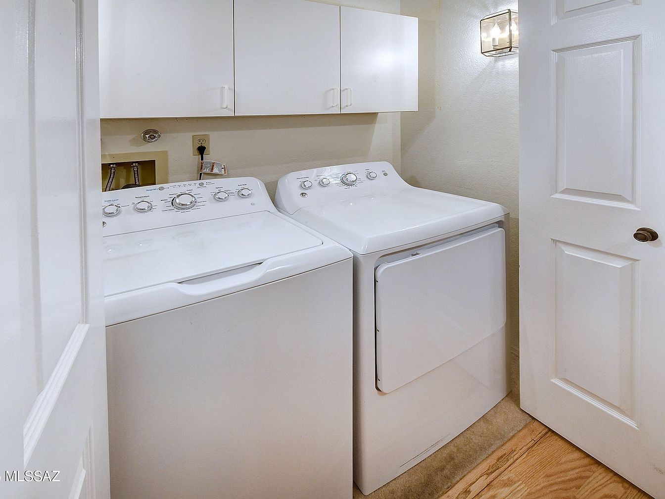 This compact laundry area features a pair of white, top-loading washing machine and dryer units positioned side by side. Above them, minimalist white cabinetry provides practical storage space, maintaining a clean and uncluttered visual flow. The walls are painted in a neutral beige tone contributing to a warm and simple aesthetic, while a modern wall-mounted light fixture enhances illumination. The flooring transitions from light wood to a soft carpet section, adding texture and warmth to the small but functional space. The white paneled door with a bronze handle completes the room’s modest charm.