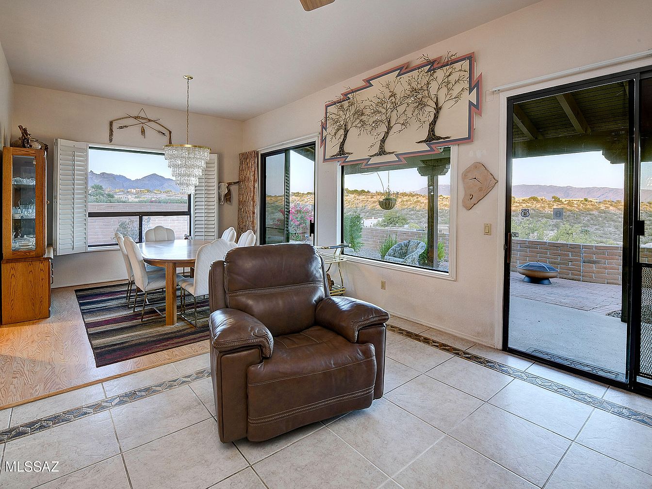 This inviting dining space features a round wooden table surrounded by six cushioned white chairs set on a striped area rug contrasting with the surrounding light wooden and tiled floors. A stunning, multi-tiered crystal chandelier hangs overhead, adding elegance to the cozy room. Large windows and sliding glass doors offer expansive desert and mountain views, seamlessly connecting the indoors with the outdoor patio area furnished with casual seating and a fire pit. Walls are adorned with Southwestern-inspired artwork and rustic decorations, complementing the neutral tones and natural light that fill the space.