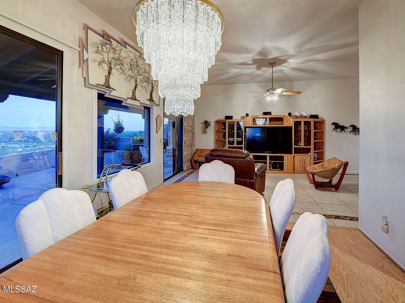 This open-plan space features a warm wooden dining table surrounded by six cushioned chairs in soft white upholstery, creating an inviting eating area. Above, a grand crystal chandelier adds elegance and visual interest, reflecting light beautifully across the ceiling. Large windows and sliding glass doors open onto an outdoor patio, allowing natural light and scenic views to fill the room. Beyond the dining area, a comfortable living room with a brown leather chair and a uniquely designed wooden lounge chair faces a built-in entertainment center with a flat-screen TV. The neutral walls and ceramic tile flooring balance the space with understated simplicity and warmth.