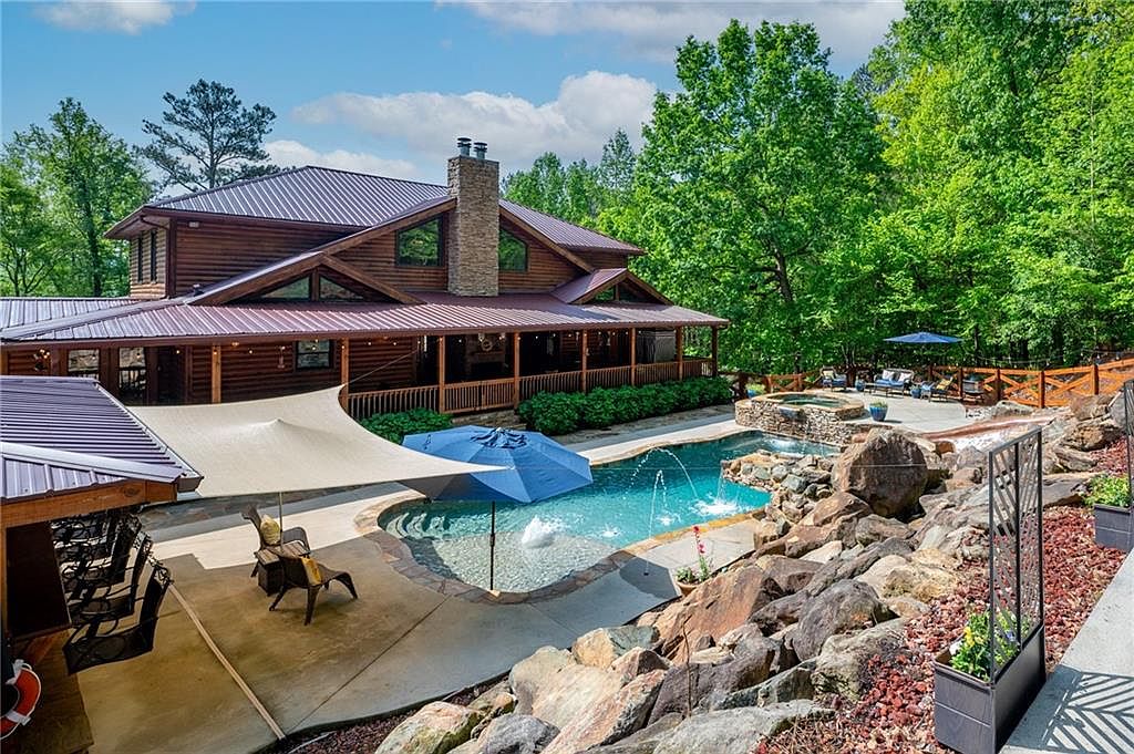 This outdoor living space centers around a freeform swimming pool featuring gentle curved edges and built-in water fountains, creating a serene, inviting atmosphere. A cozy spa area with stone accents sits adjacent to the pool, perfect for relaxation. A mix of natural rock landscaping and lush greenery borders the space, blending harmoniously with the wooded surroundings. Covered seating areas and large shade umbrellas provide comfortable spots to lounge, while the expansive wraparound porch of the log-style house adds rustic charm. The metal roof and stone chimney complement the earthy color palette, creating a balanced and tranquil retreat.