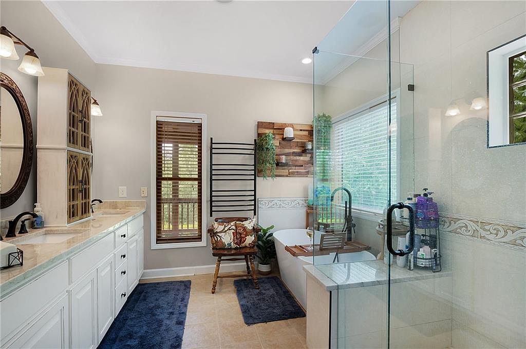 This bathroom combines classic and modern elements through a harmonious blend of design. The long white vanity with black hardware provides ample storage and a polished marble countertop, highlighted by an oval mirror with a dark frame. Walls painted in a soft beige offer a neutral backdrop, enhancing the natural light pouring in from a sizable window equipped with wooden blinds. A freestanding bathtub rests beside a wooden chair adorned with a floral cushion, bordered by lush greenery and a wall-mounted wooden panel. A glass-enclosed shower with elegant tiling and intricate trim adds sophistication, while plush navy blue rugs add warmth and comfort underfoot. The overall aesthetic balances comfort and luxury with thoughtful natural touches.