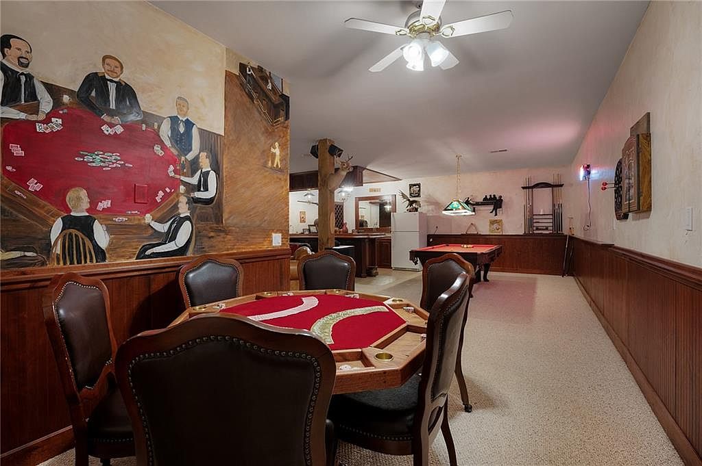 This inviting game room features a warm, cozy ambiance with wood paneling along the lower half of the walls, contrasting against light-colored upper walls and ceiling. At the forefront is a stylish octagonal poker table with a red felt surface and six cushioned, leather-paneled chairs, perfect for social game nights. A large mural depicting a poker game enhances the wall behind the table, adding character and a playful theme. Toward the back, a classic pool table under a green billiard lamp provides additional entertainment options. The room also includes a small bar area and a white refrigerator, blending leisure with practicality. Soft carpet flooring and ceiling fan lighting contribute to an inviting, comfortable atmosphere.