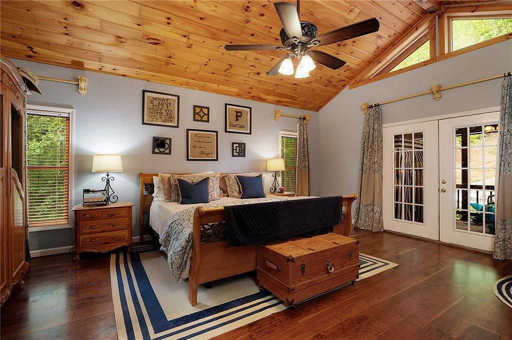 This master bedroom features a warm and inviting ambiance with a vaulted ceiling clad in natural wood planks, adding rustic charm and architectural interest. Soft blue-gray walls contrast gently with the rich hardwood flooring, while a large area rug with navy blue stripes anchors the space. The centerpiece, a wooden sleigh bed, pairs with tasteful bedding in neutral tones accented by navy pillows. Matching wooden nightstands with elegant black metal lamps flank the bed. Light filters softly through narrow vertical windows, dressed with patterned drapes, and white French doors open to an outdoor area, enhancing openness and light.