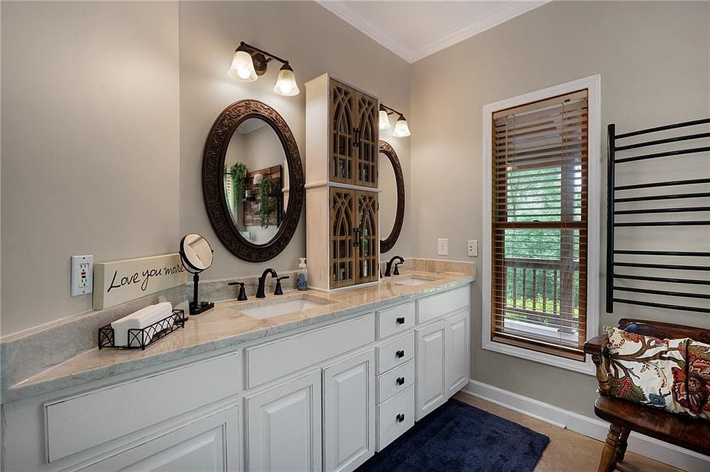 This bathroom vanity features a spacious double sink countertop with a polished stone surface. The cabinetry is painted in a clean white, presenting a classic and bright look. Between the two oval mirrors, a vertical decorative cabinet with arched glass doors adds a charming, vintage touch. Soft neutral wall colors contrast gently with the dark bronze fixtures and mirror frames, adding warmth and elegance. Above each mirror, two light sconces provide ample illumination. A window with wooden blinds allows natural light to fill the space, while a wooden bench adorned with patterned cushions offers a cozy seating option. The blue floor mat adds a subtle pop of color and comfort underfoot.