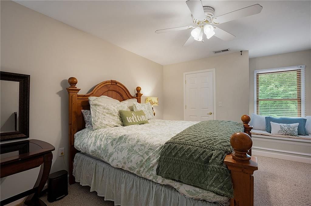 This serene bedroom features a classic wooden bed frame with a rich honey finish, complemented by soft bedding in muted greens and floral patterns. A knitted green throw blanket and a welcoming green pillow add a touch of warmth and comfort. Light beige walls provide a neutral backdrop, making the space feel calm and inviting. Natural light floods in through a window with wooden blinds, next to a cozy window seat adorned with pale blue cushions. The room also includes a dark wood side table with a large mirror resting on it and a ceiling fan with white blades, maintaining air circulation while blending seamlessly with the bright ambiance.