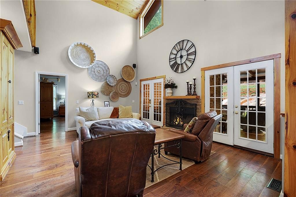 This living room features a high vaulted ceiling with natural wood paneling, creating an open, airy atmosphere. Warm wood floors complement the wood trim around the doors and windows. The space is anchored by a cozy fireplace with a rustic wooden mantle, adorned with candlesticks and a small floral arrangement. A large black clock adds a classic touch above the fireplace. Two leather armchairs and a large ottoman face a cream-colored sofa decorated with neutral and warm-toned cushions. A collection of woven wall baskets adds texture and visual interest to the neutral-toned walls. French doors open to an outdoor area, inviting natural light inside.