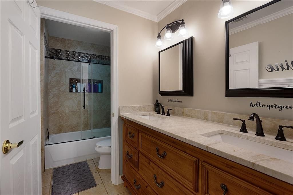 This bathroom features a spacious double vanity with a polished stone countertop and warm wooden cabinetry, lending a classic and inviting feel. Two rectangular mirrors with black frames hang above the sinks, flanked by stylish black faucet fixtures that contrast elegantly against the light beige walls. The lighting fixtures above provide soft, warm illumination enhancing the cozy atmosphere. Adjacent to the vanity is a tiled shower and tub combination with sliding glass doors, accented by mosaic tile trim at the top and a recessed shelf, showcasing a blend of functionality and subtle decorative detail.