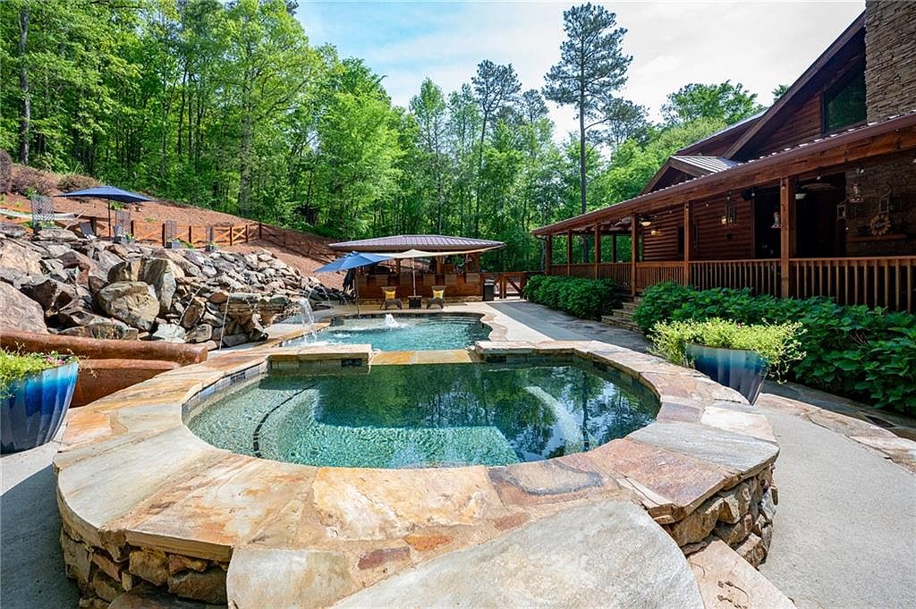 This inviting outdoor space features a stone-clad hot tub seamlessly connected to a spacious swimming pool with gentle water fountains creating a soothing ambiance. Surrounding the pool is a stone deck that complements the natural rock slope on one side, enhancing the rustic charm. A cozy wooden cabin with a covered porch lines one side of the pool, adding warmth and continuity with its rich wood tones. Comfortable seating areas under umbrellas provide shaded spots for relaxation. Lush greenery and tall trees in the background frame this tranquil retreat, blending natural elements with refined outdoor living.