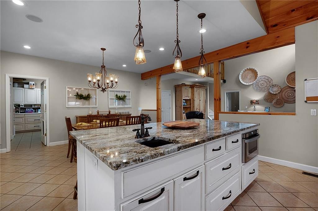 This open kitchen space features a large central island topped with polished granite, showcasing a rich blend of gray, cream, and brown tones. The island has white cabinetry with black hardware and is equipped with a small built-in oven and faucet, emphasizing both style and functionality. Above the island, three pendant lights with antique bronze fixtures add a warm glow. The adjoining dining area contains a wooden table and chairs in a darker finish, coordinating with the exposed wooden beam that frames the kitchen, blending rustic charm with modern design. Light beige tiles cover the floor, complementing the neutral walls and subtle greenery accents. In the background, the adjacent pantry and a cozy nook with baskets mounted on the wall contribute to an inviting, well-organized living environment.