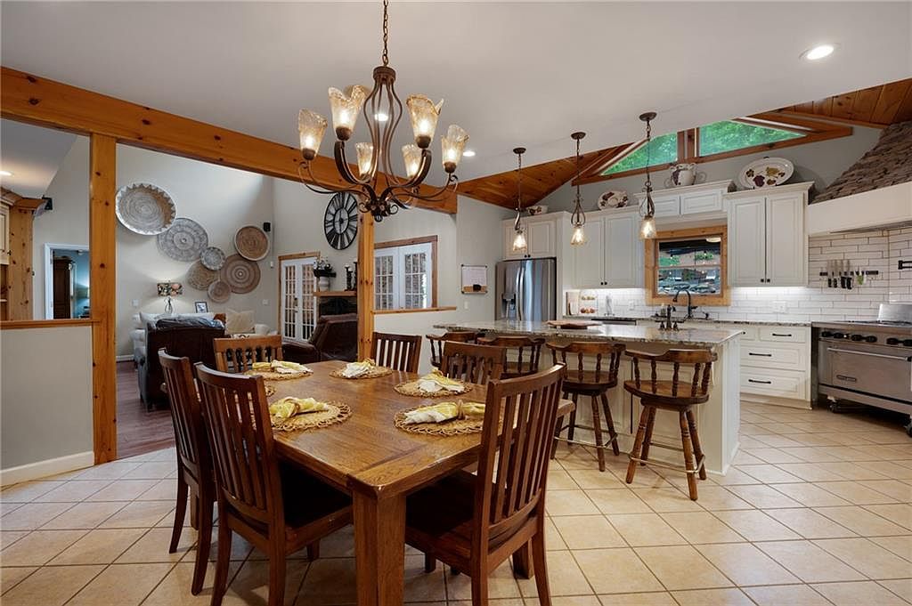 This open-concept space elegantly combines a warm dining area with a bright kitchen. The dining area centers around a large wooden table surrounded by eight matching chairs, all coordinated with natural woven placemats and cloth napkins. Above, a classic chandelier with amber glass shades hangs from a white ceiling framed by warm wooden beams and columns, adding rustic charm. The kitchen features white cabinetry and subway tile backsplash, contrasted by darker granite countertops. A set of three wooden stools lines the kitchen island, illuminated by hanging pendant lights. Large windows and a stone accent wall enhance the inviting atmosphere, while the tiled floor ensures practicality and flow throughout.
