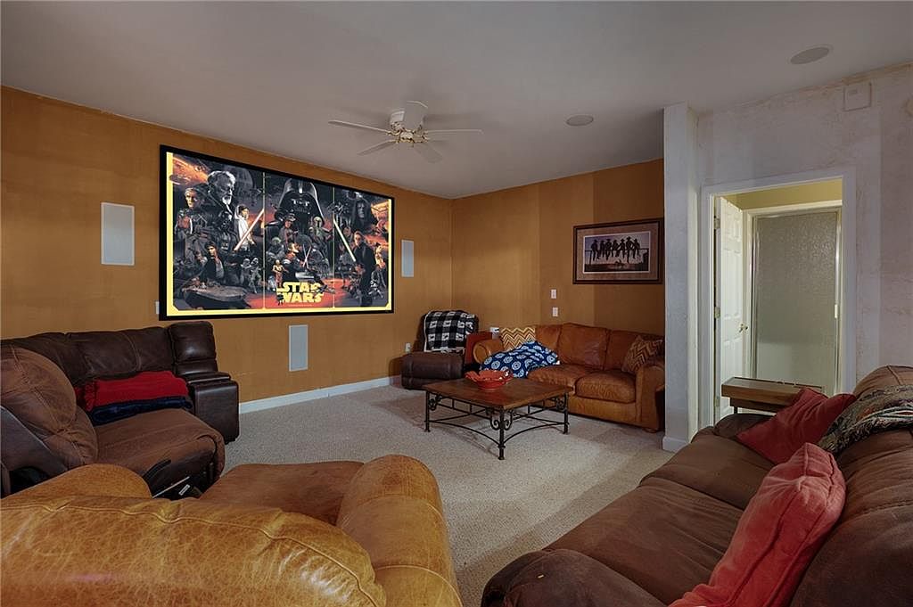 This cozy home theater lounge features a warm, muted color palette with tan walls and beige carpet flooring that invites relaxation. Seating includes a variety of plush leather and fabric couches and an armchair, arranged to create a comfortable and intimate viewing area centered around a large screen mounted on the far wall. The screen showcases vibrant artwork from Star Wars, highlighting the space’s entertainment purpose. A ceiling fan adds subtle functionality, while a framed picture adorns the adjacent wall, contributing a personal touch. This room blends comfort with a casual aesthetic, perfect for movie nights.