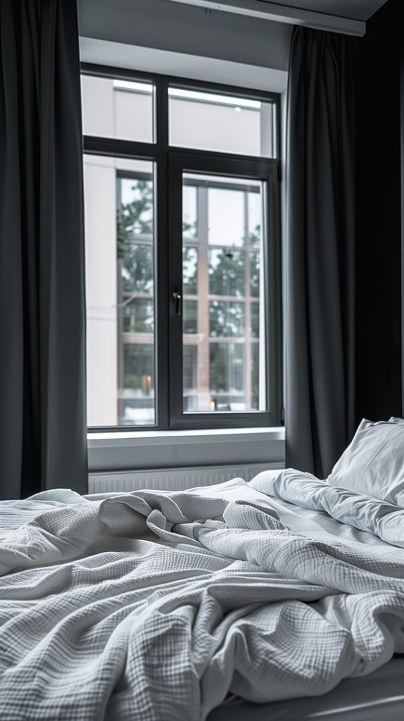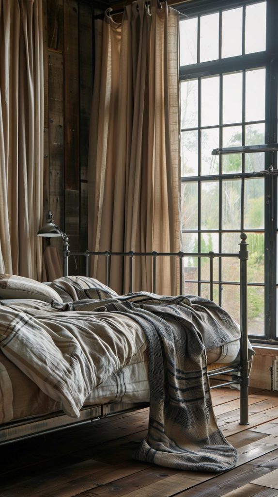 Featuring blackout curtains, this industrial bedroom ensures privacy and light control. The curtains blend functionality with style, complementing the room’s decor and enhancing its industrial aesthetic.