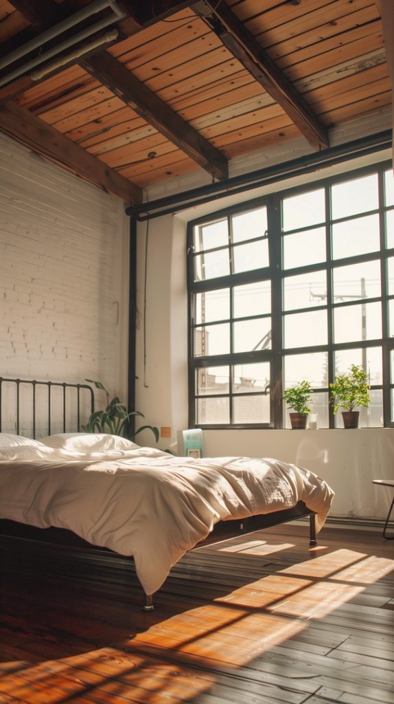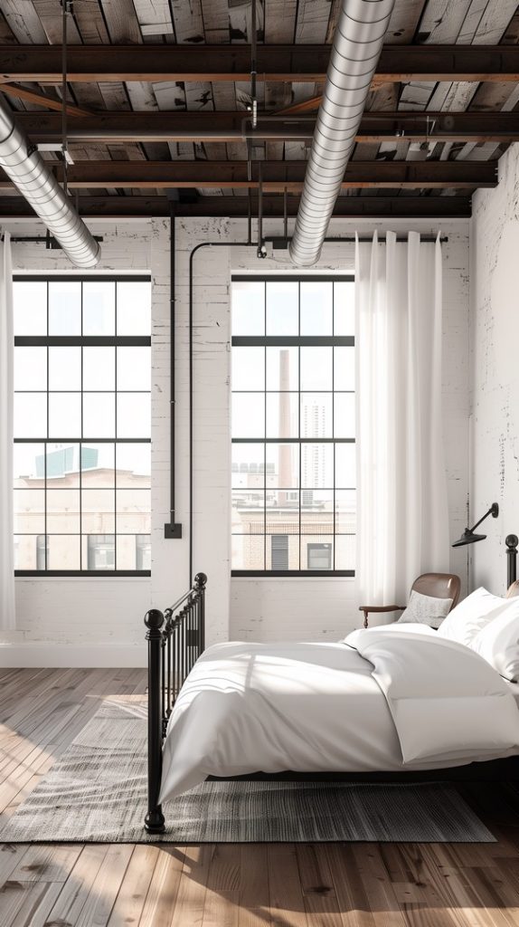 Featuring large factory-style windows, this industrial bedroom is filled with natural light. The windows enhance the room’s spacious feel and industrial aesthetic, creating a bright and airy environment.