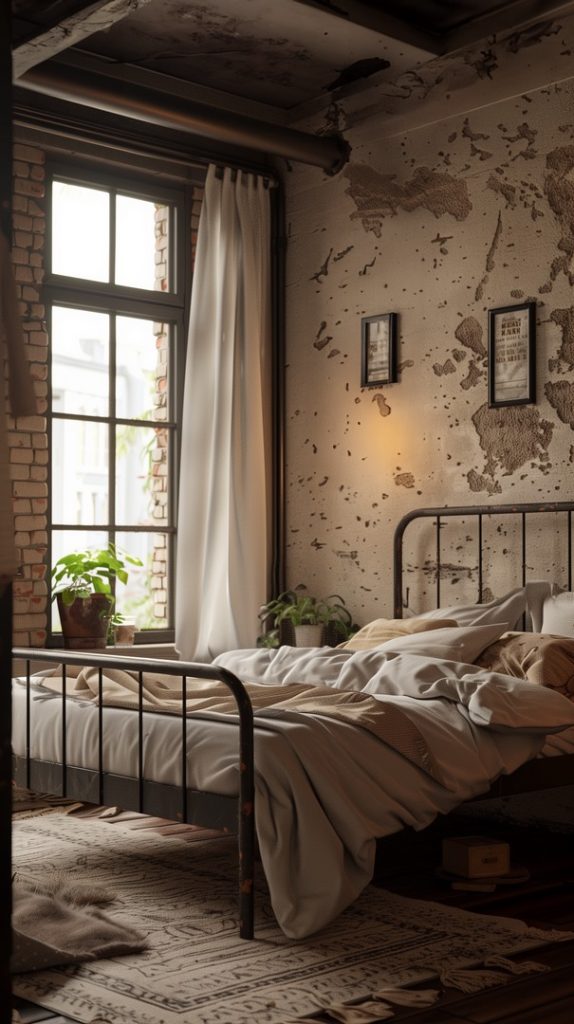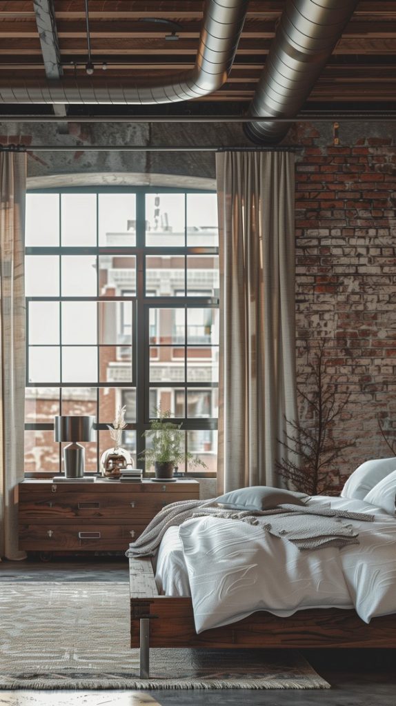 An industrial bedroom that showcases a mix of textures, including metal, wood, and fabric. The varied textures create visual interest and enhance the room’s depth, making it rich and inviting.