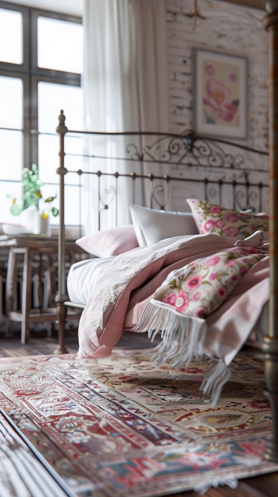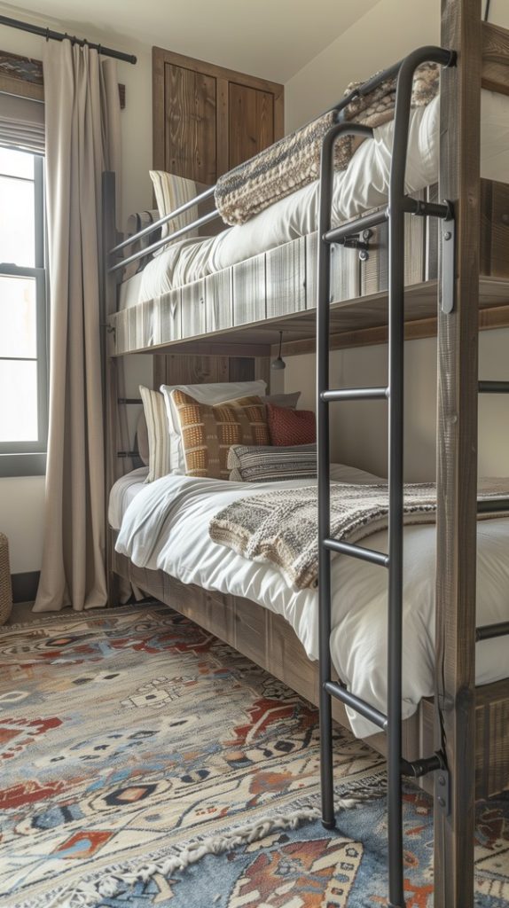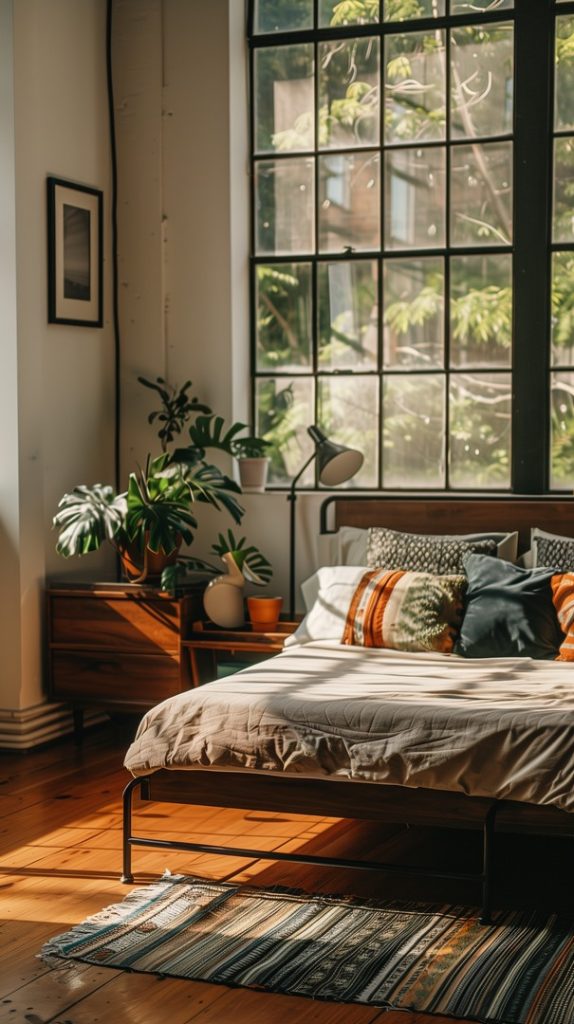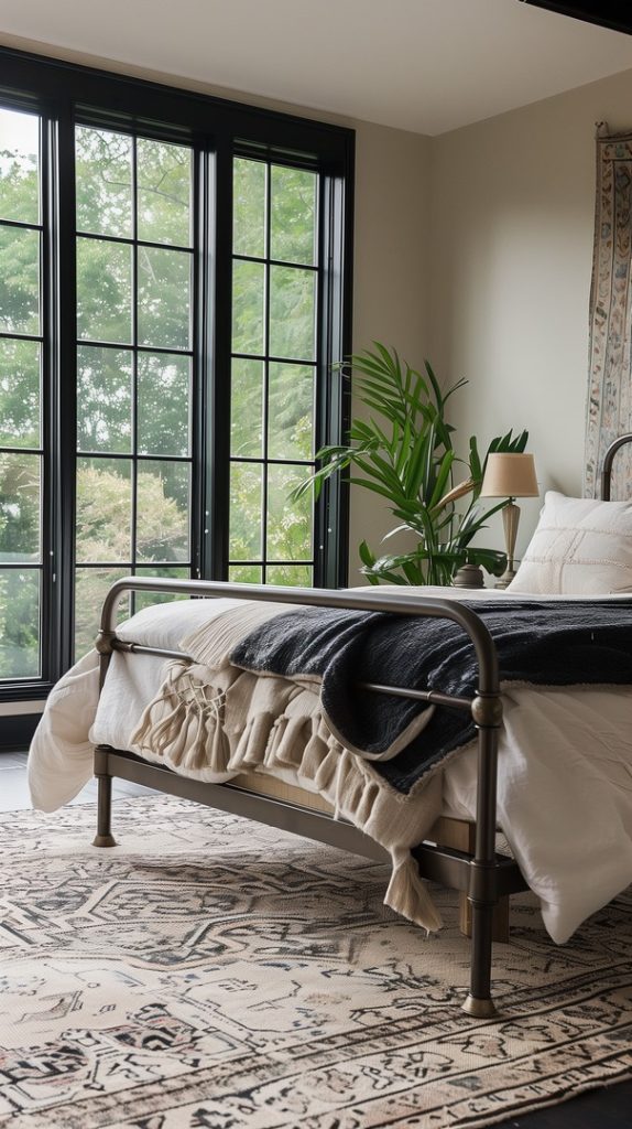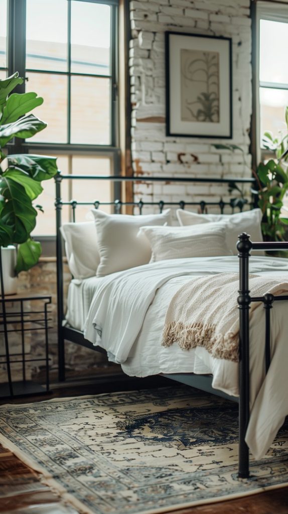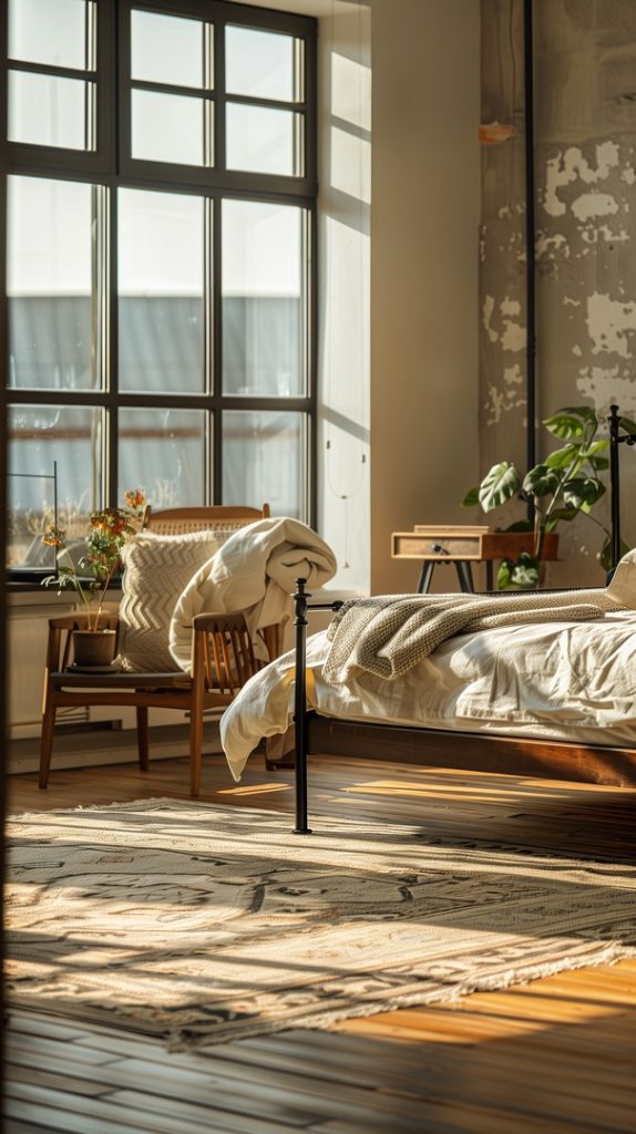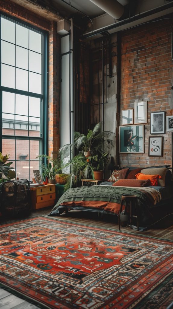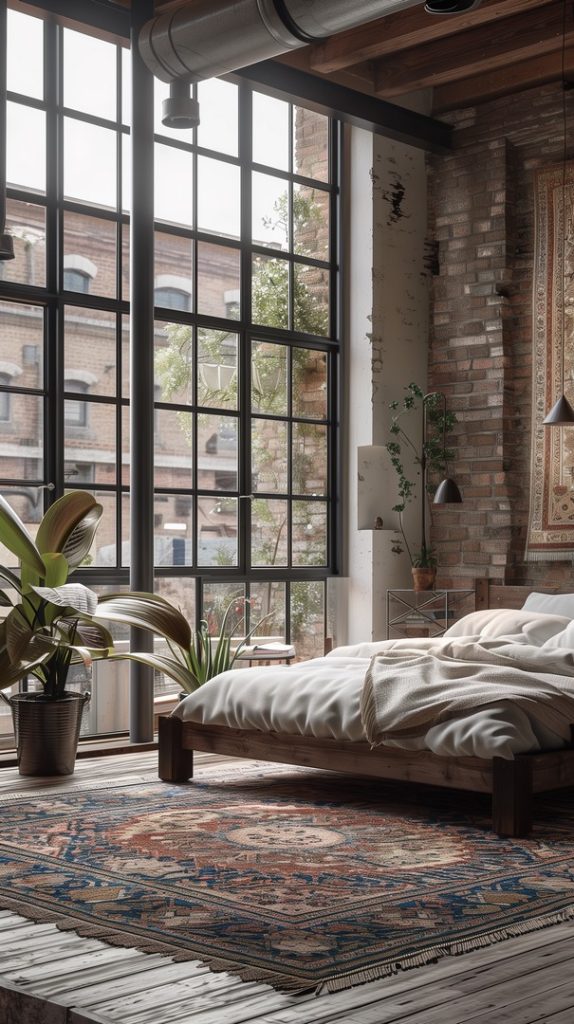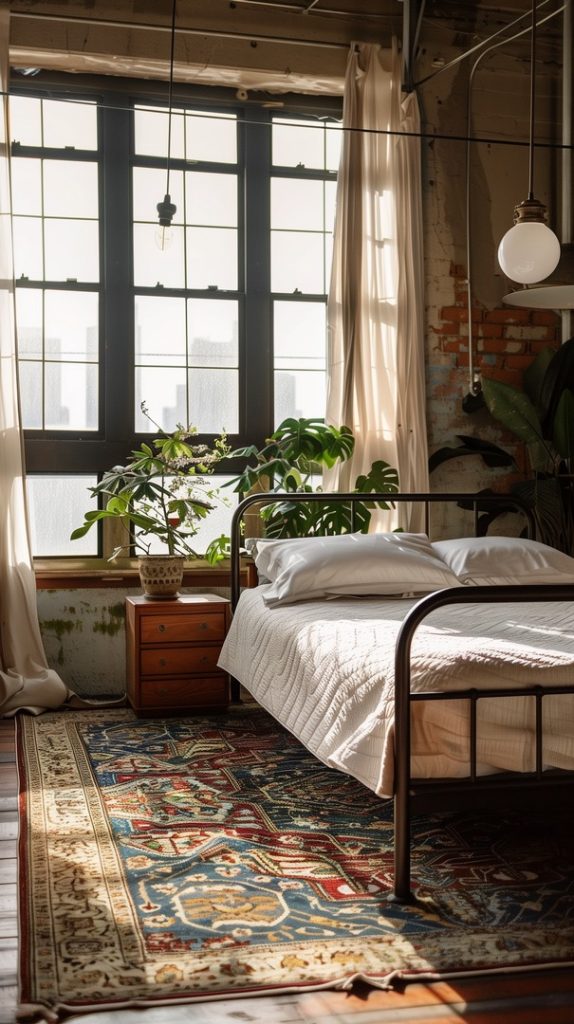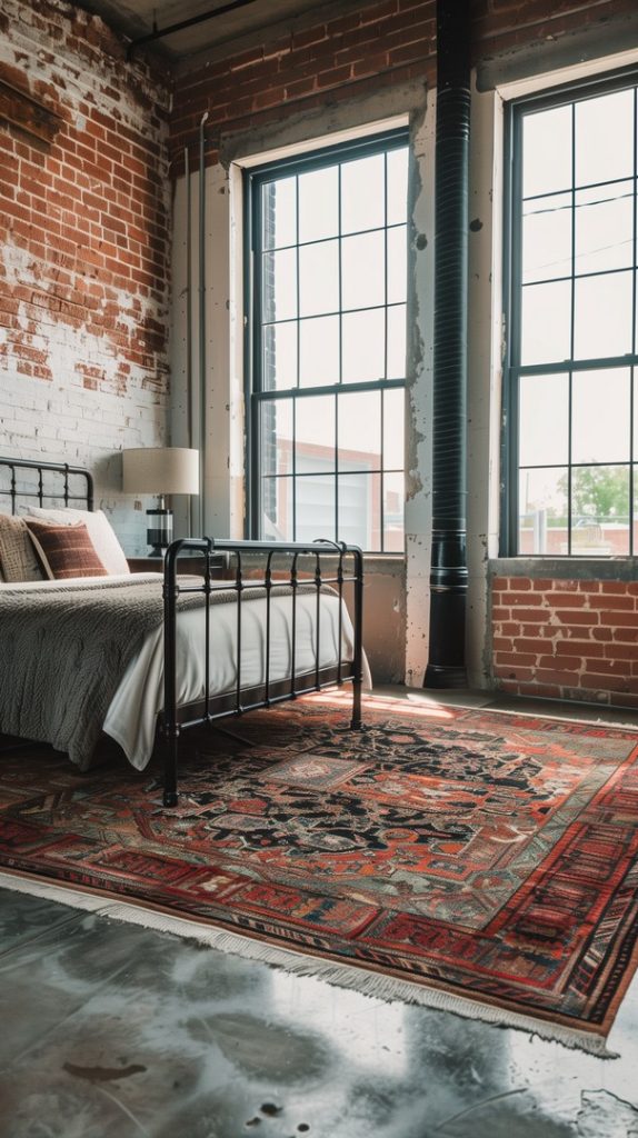 Featuring vintage rugs, this industrial bedroom adds warmth and character. The rugs’ intricate patterns and aged appearance complement the industrial decor, adding a touch of history and charm.