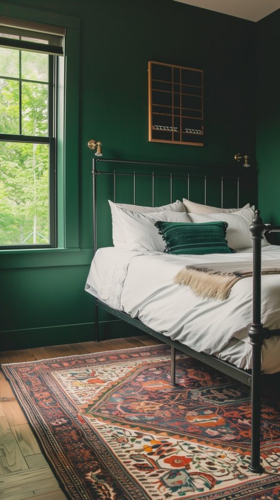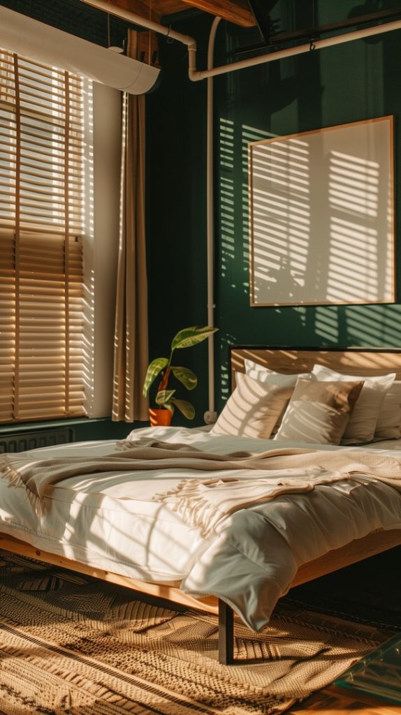 This industrial bedroom uses emerald green accents to add a pop of color and sophistication. The rich green tones complement the industrial materials, creating a striking and elegant look.