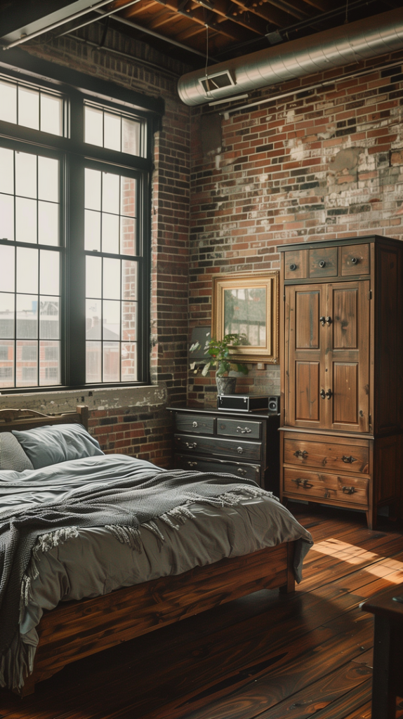This industrial bedroom incorporates rustic elements, such as reclaimed wood and vintage decor. The mix of rustic and industrial styles creates a warm and inviting space with a unique character.