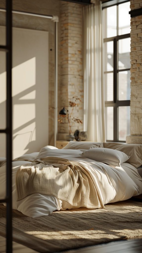 An industrial bedroom with earth tones that create a warm and inviting atmosphere. The use of natural colors and materials blends seamlessly with the industrial decor, creating a cozy and harmonious space.