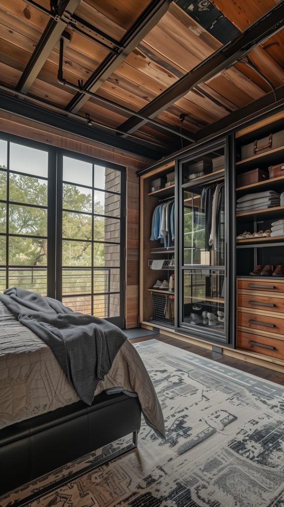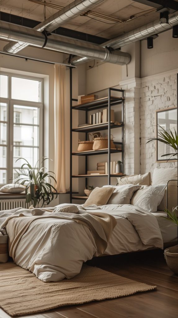 Innovative closet solutions in this industrial bedroom maximize storage while maintaining the room’s stylish design. Open shelving and metal racks add to the industrial vibe, offering both functionality and style.
