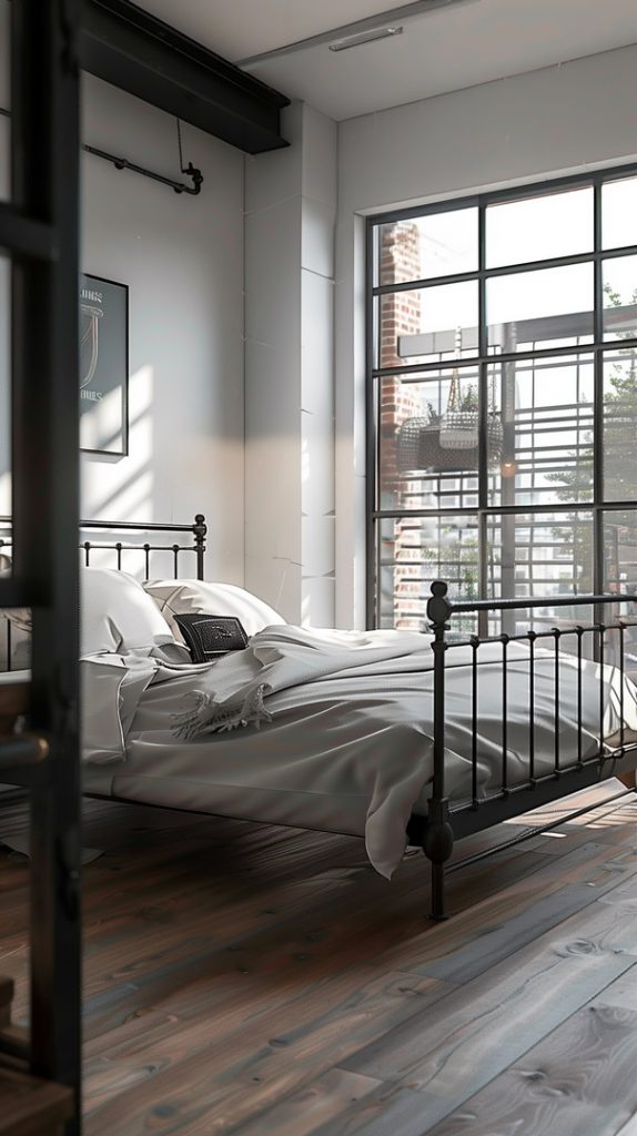An industrial bedroom with iron bed frames that add a vintage and sturdy touch. The metal frames enhance the room’s industrial vibe and provide a timeless appeal, creating a strong and stylish focal point.