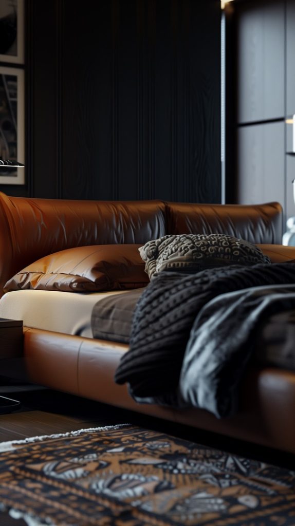 A masculine industrial bedroom with dark tones, metal accents, and functional furniture. The minimalist design and strong lines create a sleek and sophisticated environment, perfect for a modern and stylish look.