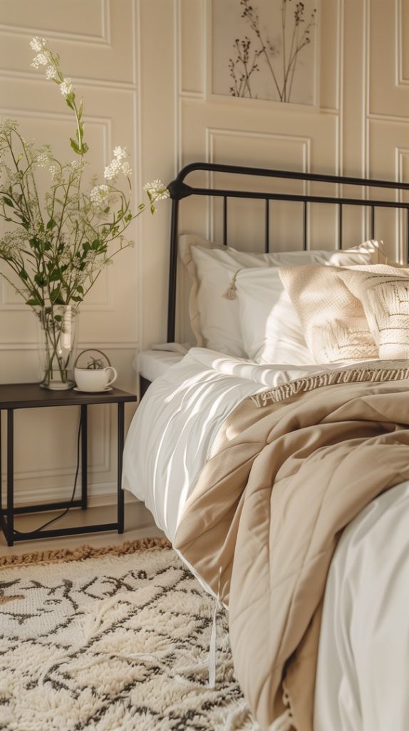 A feminine industrial bedroom with soft touches and elegant decor. The design combines industrial elements with delicate details, creating a balanced and stylish space that is both edgy and chic.