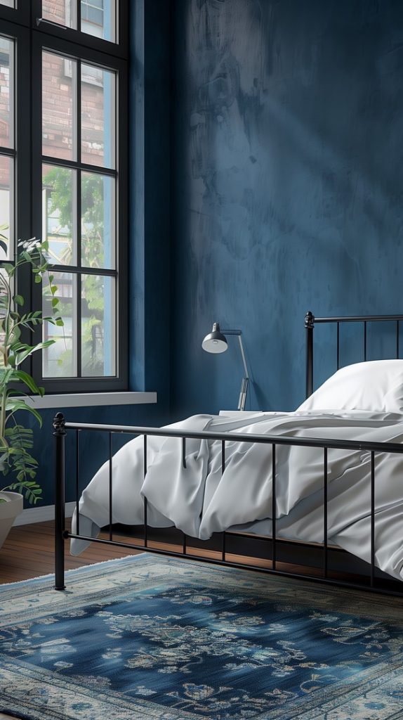 An industrial bedroom with a blue color scheme that adds a cool and calming effect. The blend of blue tones with industrial materials like metal and wood creates a balanced and inviting atmosphere, perfect for relaxation.