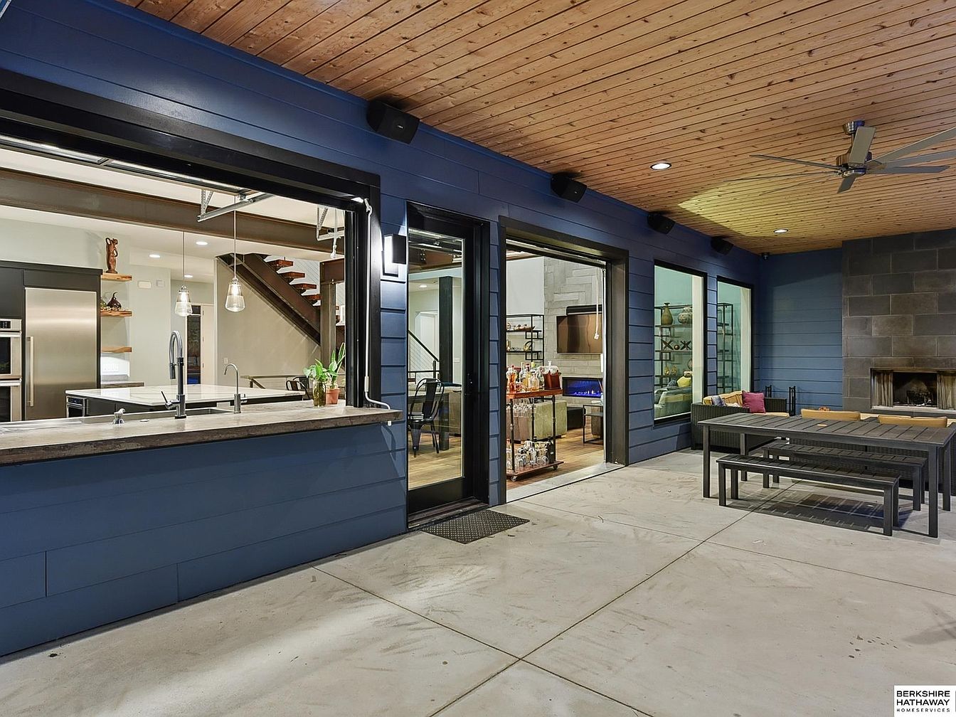 This inviting outdoor patio features a sleek, modern design with a smooth concrete floor and a natural wood paneled ceiling that adds warmth and texture. Deep blue horizontal siding contrasts elegantly with black window and door frames. A large outdoor dining table with benches offers ample seating next to a built-in fireplace with dark tile surround, perfect for cozy evenings. The space connects seamlessly indoors through expansive glass doors and a pass-through window to the kitchen, creating effortless indoor-outdoor living. Recessed lighting and a ceiling fan complete this polished, functional relaxing area.