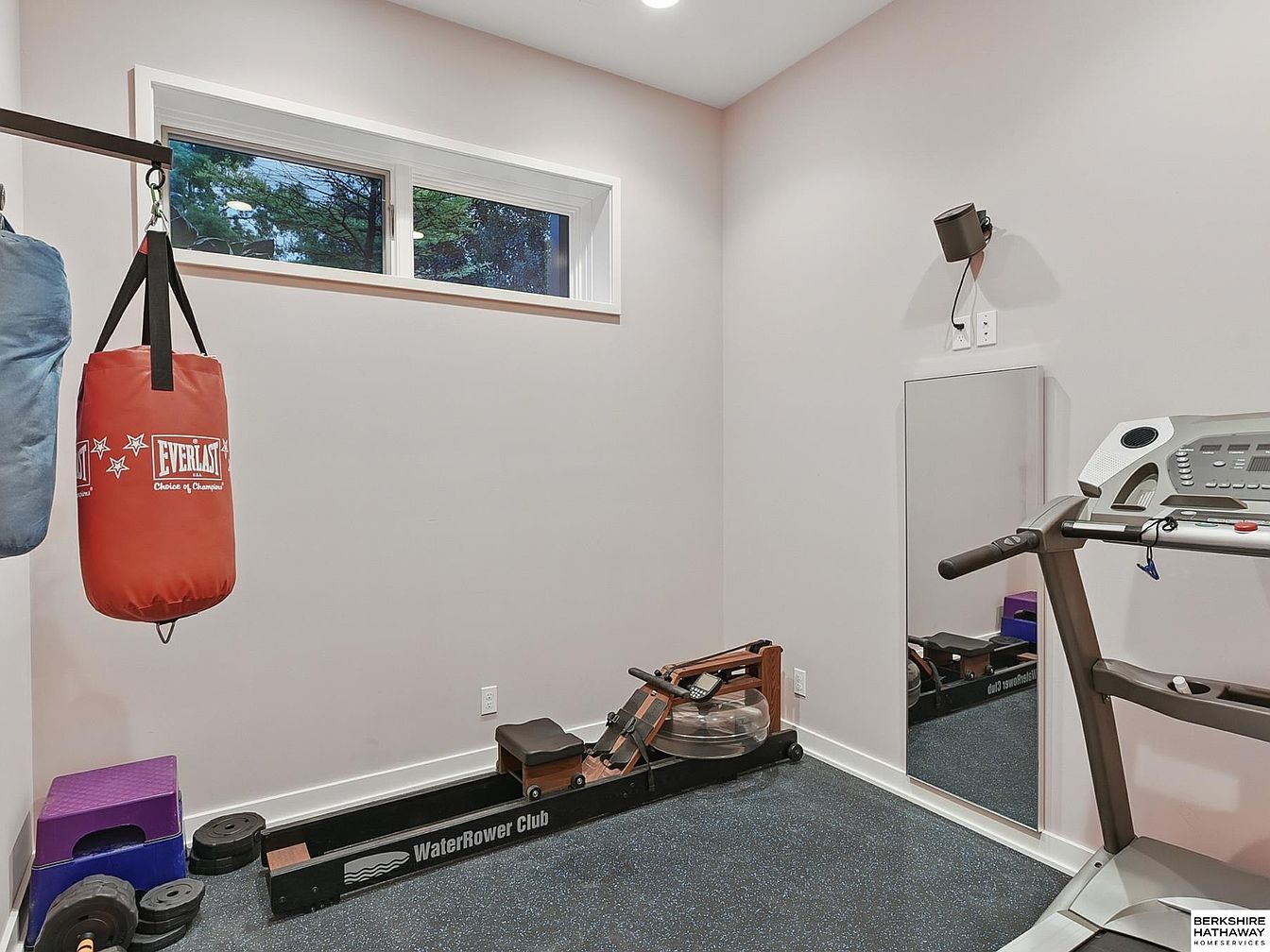 This compact workout space is designed with functionality in mind, featuring a punching bag suspended near a high horizontal window that allows natural light in while maintaining privacy. The walls are painted in a soft neutral tone, creating a calm atmosphere. Flooring consists of durable, speckled rubber suitable for exercise impact. Equipment includes a WaterRower rowing machine placed against the far wall and a treadmill positioned to the right of a tall, narrow mirror for form-checking during workouts. A simple, wall-mounted light fixture above the mirror offers focused illumination. A small purple step platform and weight plates are neatly arranged, maximizing the room’s practical layout.