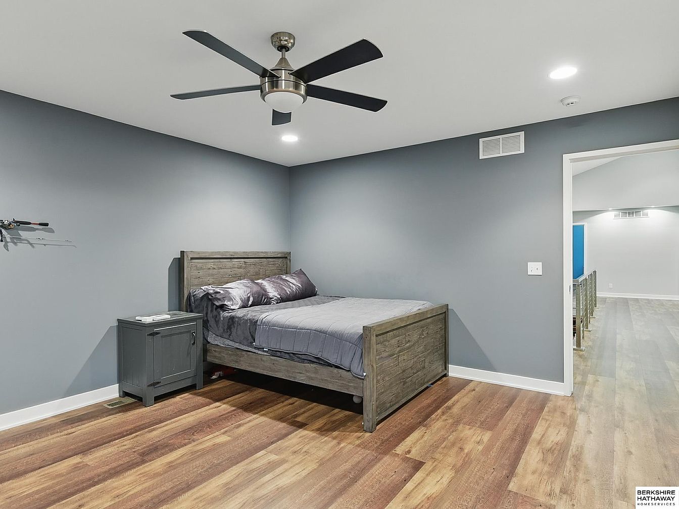 This bedroom corner combines simplicity and a muted, calming palette. The medium grey walls provide a cool backdrop that complements the rustic wood finish of the bed frame and nightstand. The bed is dressed in soft grey bedding with a slight sheen for subtle elegance. The ceiling fan with black blades and a brushed nickel fixture adds a modern touch, contrasting nicely with the natural wood tones. Recessed lighting offers an even, soft illumination, while the wood laminate flooring enhances warmth and texture, grounding the minimalist aesthetic with natural elements. A doorway leads to a spacious hallway area, suggesting an open floor plan.