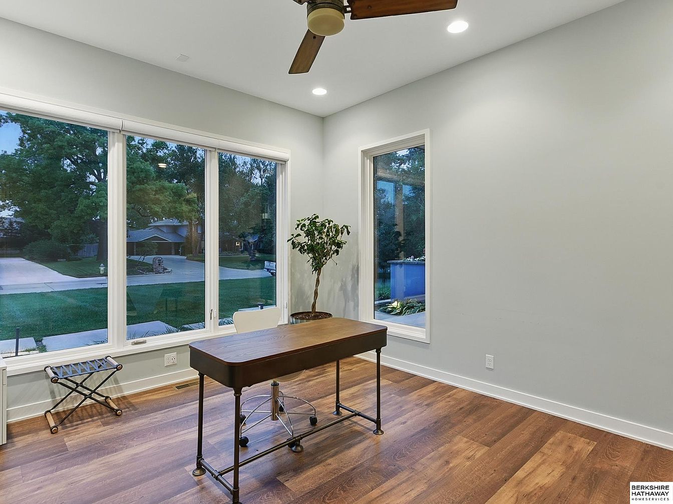 This bright home office features large, floor-to-ceiling windows wrapping around the corner, offering a stunning view of the lush, green outdoors and abundant natural light during the day. The room is spacious with light gray walls providing a clean, neutral backdrop that contrasts beautifully with the rich, warm-toned wooden flooring. A minimalist dark wood desk with slender metal legs occupies the center, accompanied by a simple white chair on casters, emphasizing functionality. A ceiling fan with wooden blades adds a subtle rustic touch while promoting airflow. The overall style is modern, airy, and inviting, perfect for focused work or study.