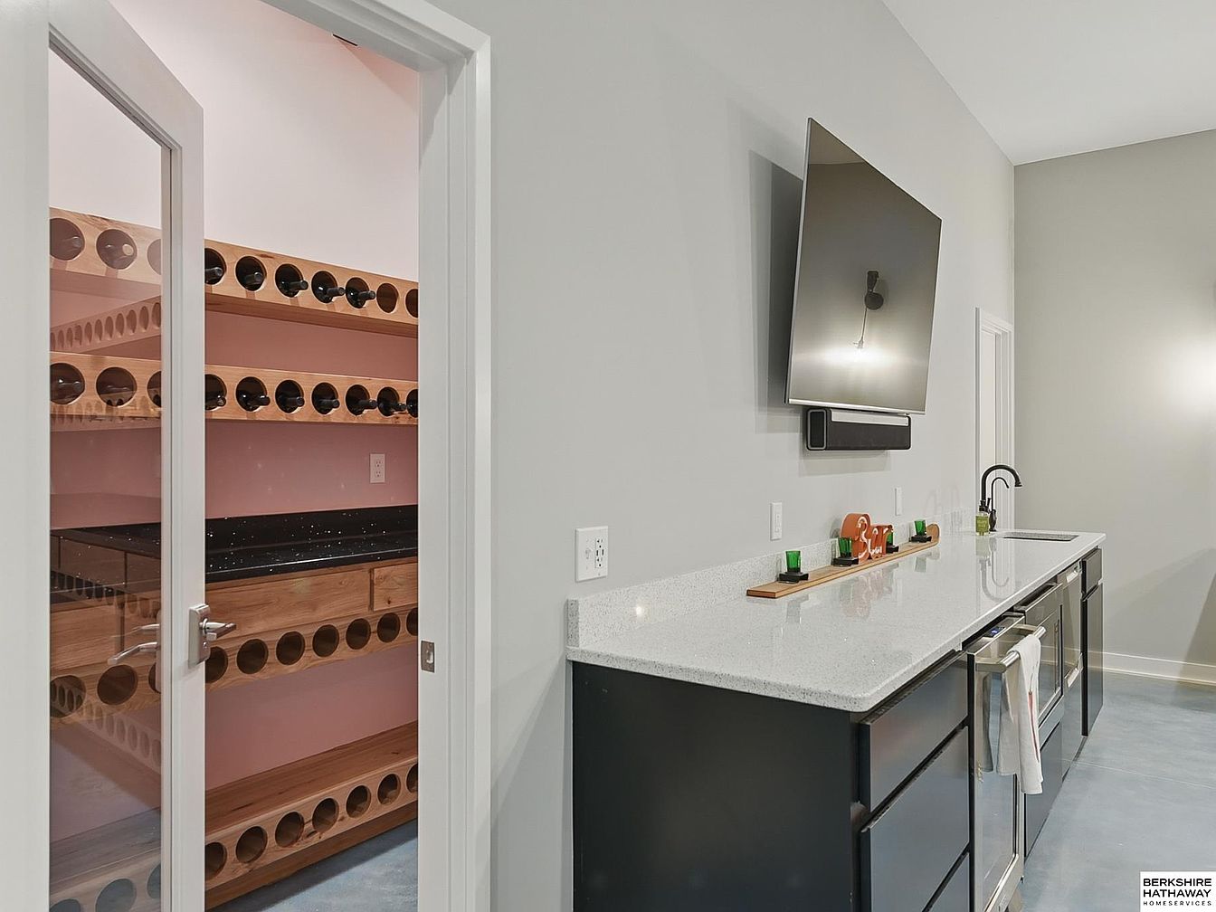 This sleek wet bar area features a long white quartz countertop paired with dark cabinetry, creating a striking modern contrast. A wall-mounted flat screen TV centers above the countertop, accompanied by a small soundbar, enhancing the entertainment vibe. The space includes a compact sink with a matte black faucet and built-in mini refrigerators below the counter for convenient beverage chilling. Adjacent to the bar is a glass-paned door revealing a custom wooden wine cellar with circular racks designed to hold wine bottles horizontally, framed by soft pink walls that add subtle warmth to the design.