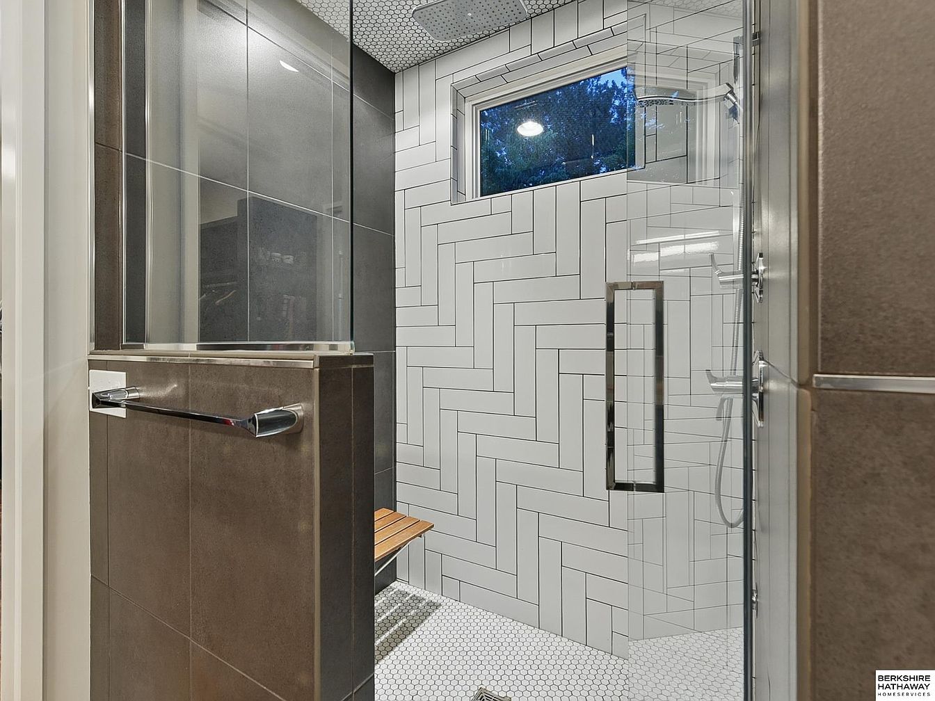 This sleek shower space features a sophisticated mix of tile textures and patterns, integrating large dark gray tiles with a glossy finish alongside striking white subway tiles arranged in a unique herringbone style. A small window provides natural light, while hexagonal mosaic floor tiles add subtle contrast. The frameless glass shower door enhances the airy feel, with chrome hardware completing the modern aesthetic. A small wooden bench inside adds warmth and functionality. Neutral colors and clean lines create a contemporary, spa-inspired retreat that balances style and comfort elegantly.