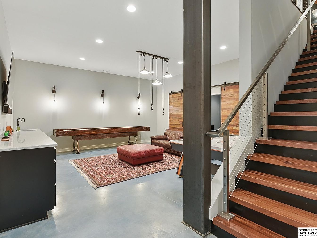 This spacious basement recreation room combines modern industrial elements with cozy touches. Polished concrete floors extend through the area, enhancing the sleek look. A large oriental rug anchors the seating zone, featuring a worn leather sofa and matching ottoman, creating a warm, inviting space. A rustic wooden shuffleboard table adds a fun recreational feature along one wall. The modern staircase with wooden steps and metal railings introduces a contemporary contrast, while the barn-style sliding wooden doors suggest additional rooms nearby. The space has a neutral palette of grays, wood tones, and deep reds, illuminated by ambient wall sconces and hanging industrial pendant lights.