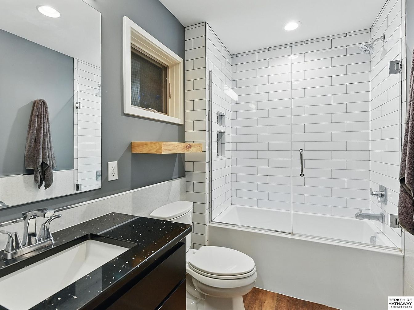 This bathroom blends modern and cozy elements with a clean, sleek design. White subway tiles with a light gray grout cover the shower walls, creating a bright and textured backdrop. The bathtub has a glass door with a chrome handle, emphasizing a minimalist aesthetic. A dark vanity countertop with subtle speckles contrasts sharply against a white undermount sink, paired with a contemporary chrome faucet. A wooden floating shelf adds warmth and natural texture beneath a small framed window. The walls outside the tile are painted a muted gray, harmonizing with the dark towel and wooden floor to complete this stylish, functional space.