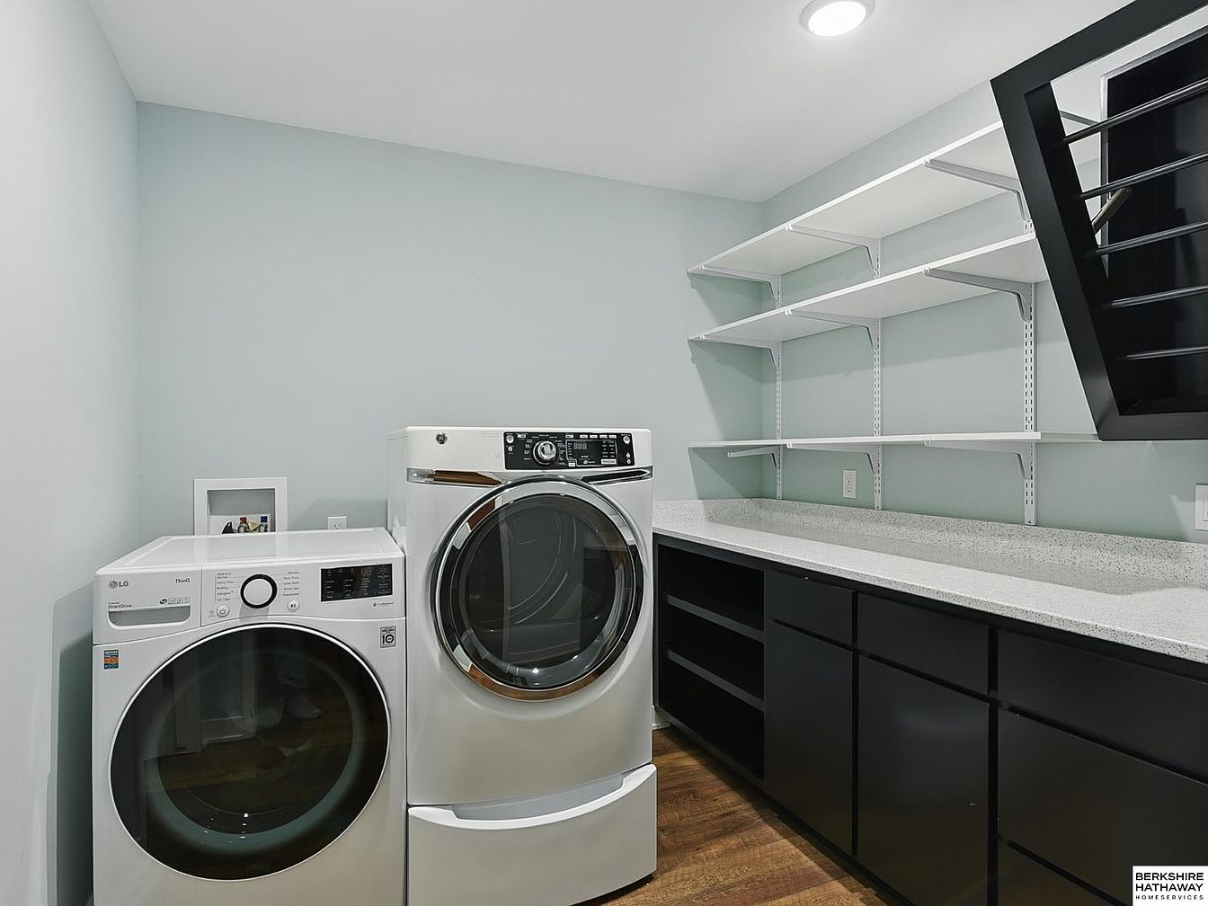 This laundry room is designed with a modern and functional approach. It features a side-by-side washer and dryer in sleek white finishes, contrasting elegantly with the matte black cabinetry below a long, white speckled quartz countertop. Above the counter, there are open white shelves supported by metal brackets, providing ample storage space for laundry essentials. The walls are painted a soft, calming light gray-blue, complementing the rich wooden floor that adds warmth to the space. Recessed ceiling lighting provides bright, even illumination, making this a practical and stylish utility area.
