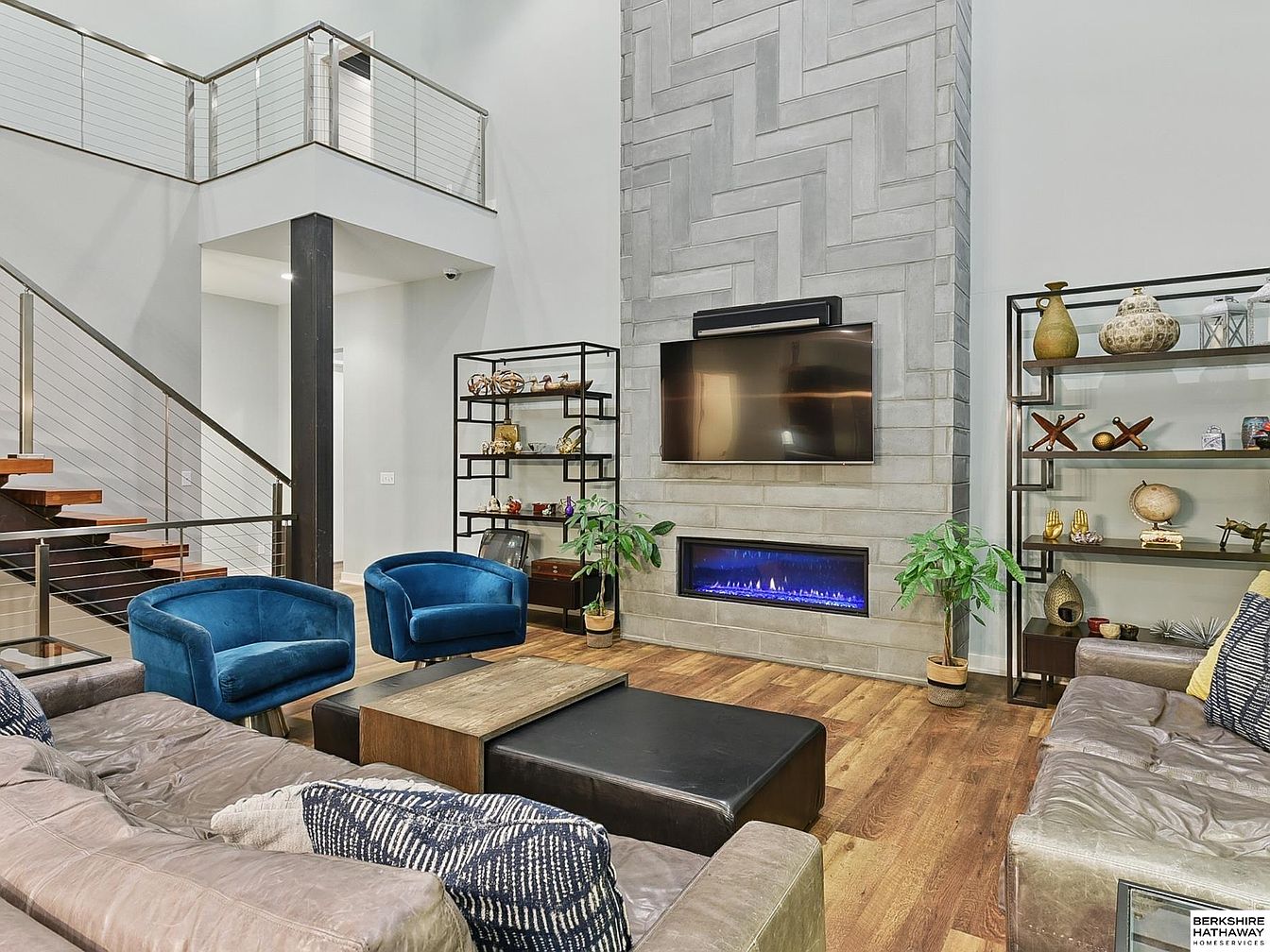 This living room features a modern, open layout with a high ceiling and a striking floor-to-ceiling fireplace wall clad in textured grey concrete tiles arranged in a herringbone pattern. A mounted flat-screen TV sits above the contemporary electric fireplace with blue flames. The space is furnished with two vibrant blue velvet armchairs and a large, taupe leather sectional sofa adorned with textured throw pillows. Warm wood flooring anchors the space, complemented by black metal and wood shelving units displaying eclectic decor. The open staircase with sleek cable railings adds to the airy, minimalist design.