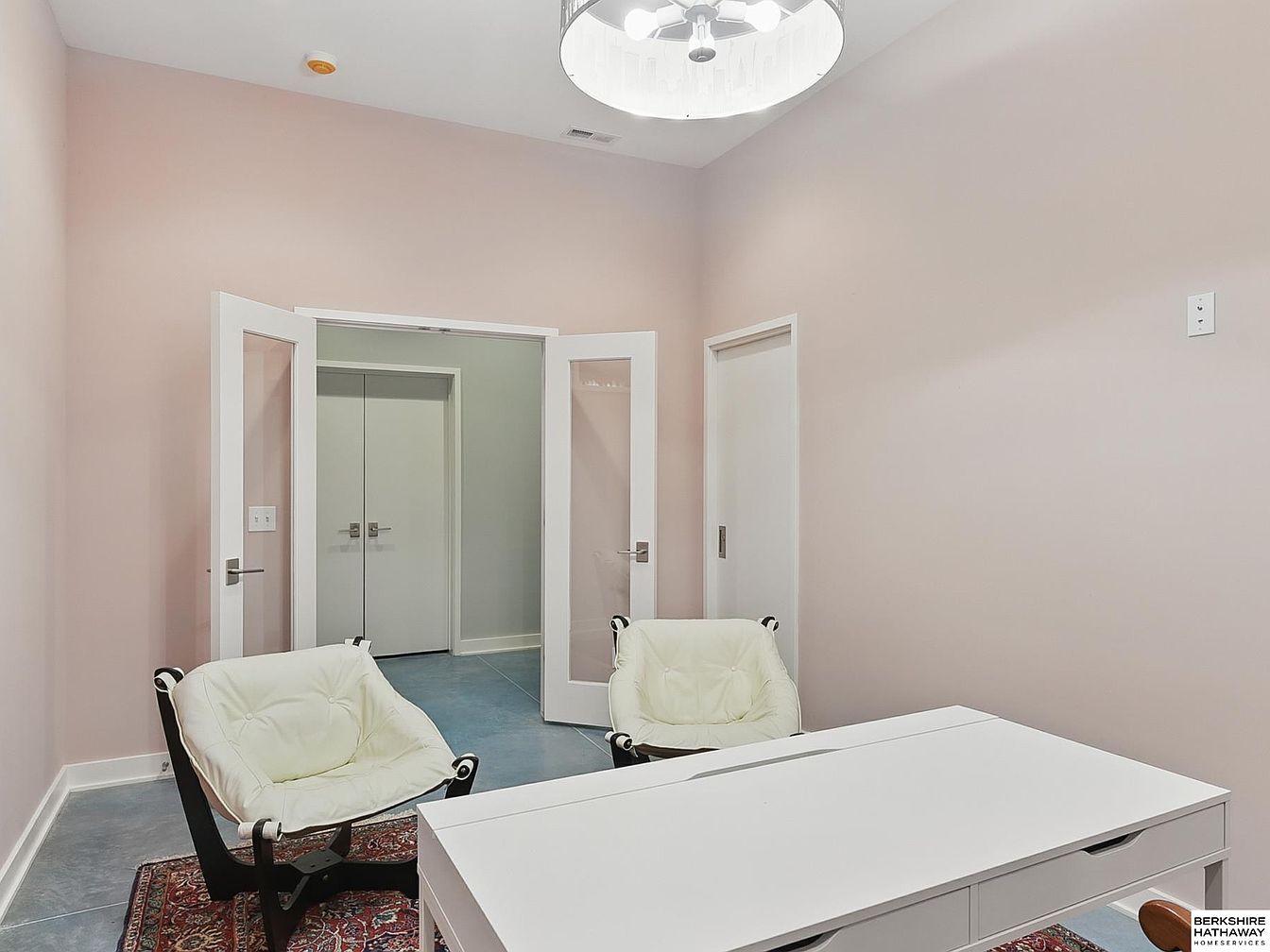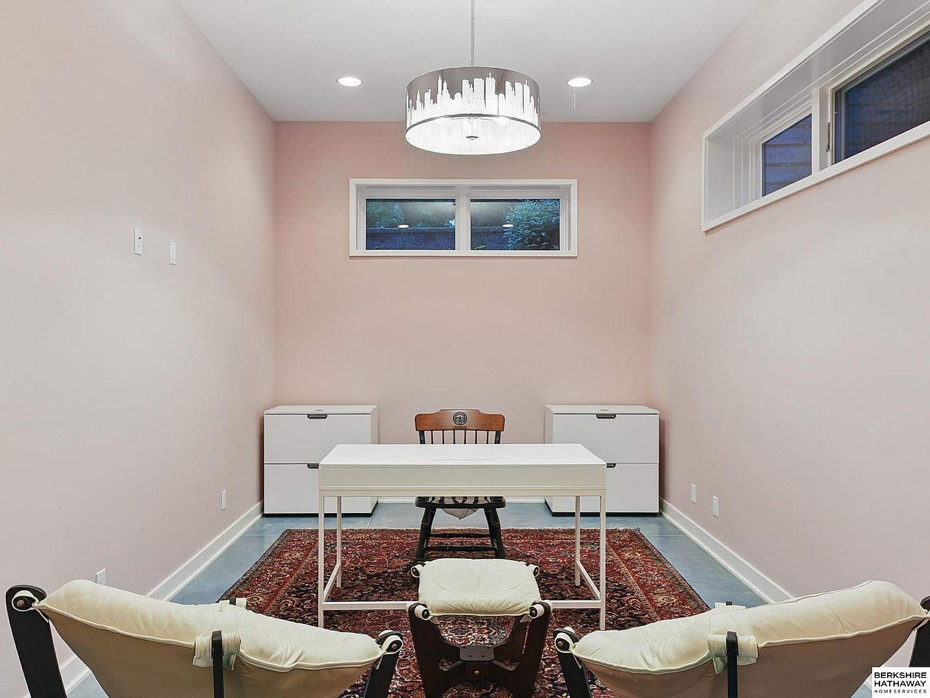 This compact home office nook features soft blush pink walls that create a calm and inviting atmosphere. A simple white desk sits centrally on a richly patterned, traditional red Persian-style rug, which adds warmth and texture to the cool-toned concrete floor. Flanking the desk are two white file cabinets providing functional storage, while a vintage wooden chair adds character and contrast. Two narrow horizontal windows near the ceiling bring in natural light without compromising privacy. Above, a modern pendant light with a cityscape design provides focused illumination, while additional recessed lighting keeps the space bright.