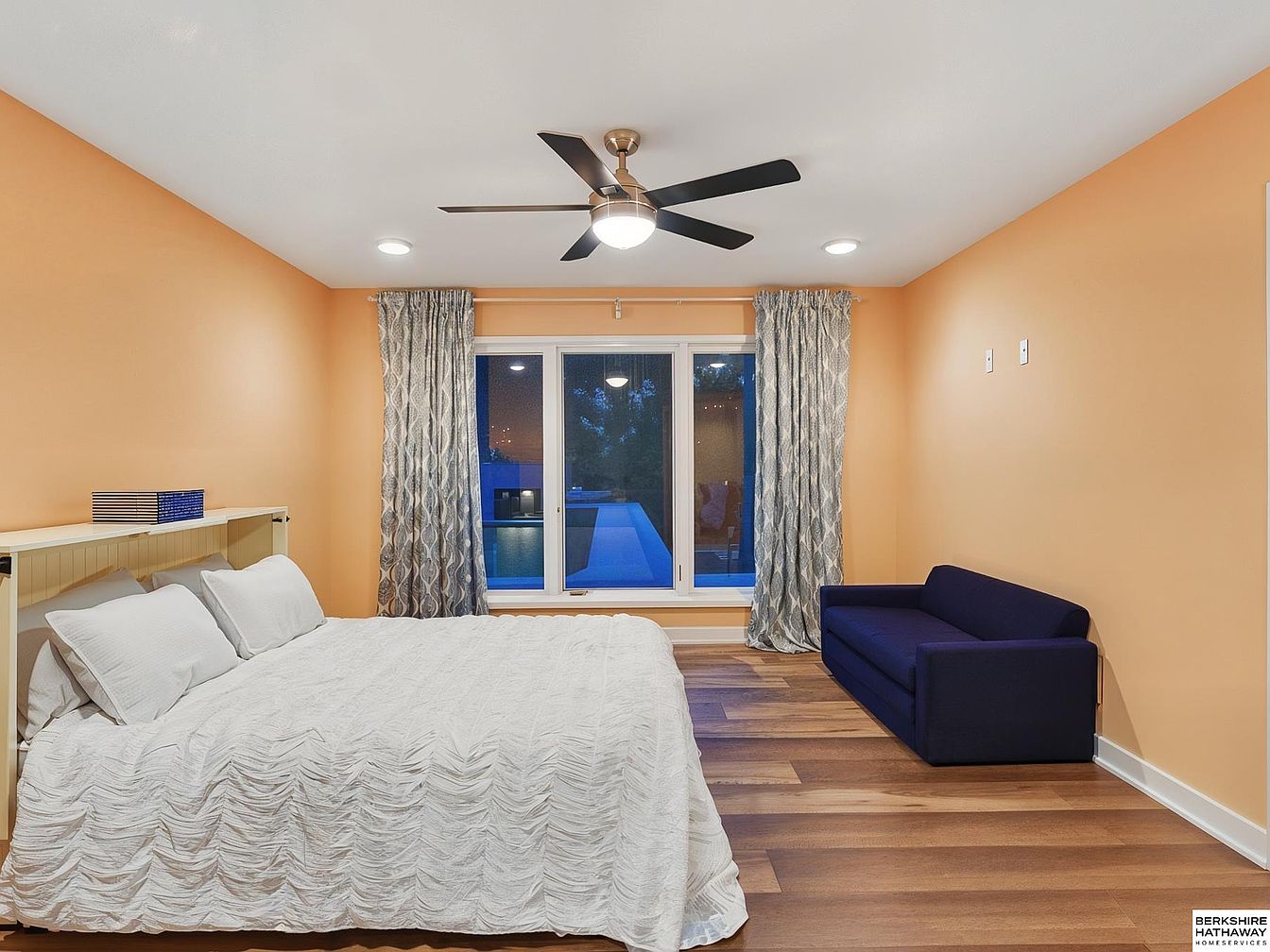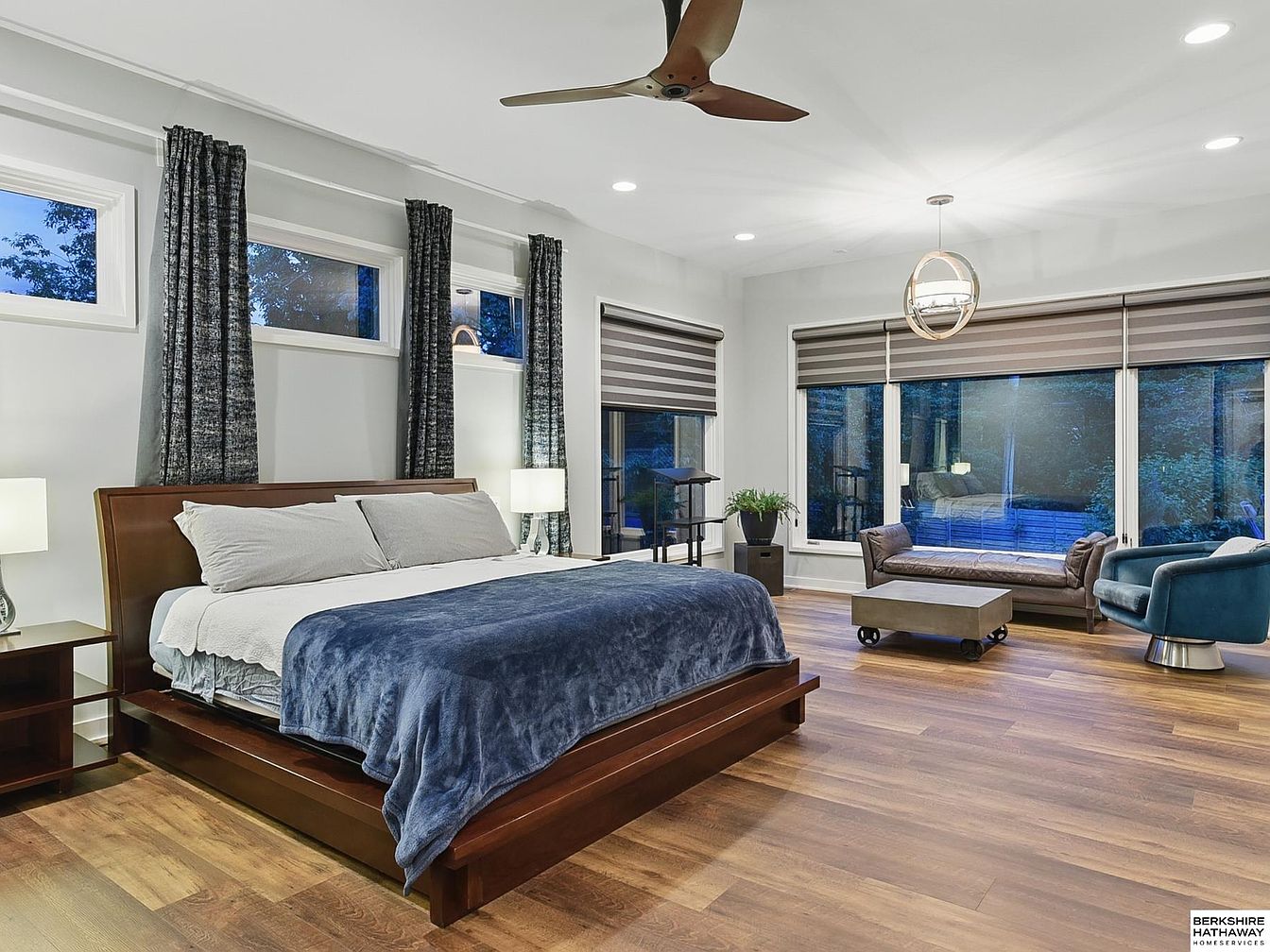 Spacious and modern, this master bedroom highlights a harmonious blend of wood, fabric, and metal accents. The large wooden platform bed, dressed in crisp white linens topped with a plush navy blanket, anchors the room. Beneath the expansive windows, a sleek leather bench contrasts with a deep blue velvet armchair, creating a cozy and stylish seating nook. The warm wood flooring complements the furniture, while soft gray walls and layered window treatments—textured curtains paired with sleek roller shades—add depth and sophistication. Recessed lighting, a contemporary ceiling fan, and a sculptural pendant light enhance the room’s serene ambiance.