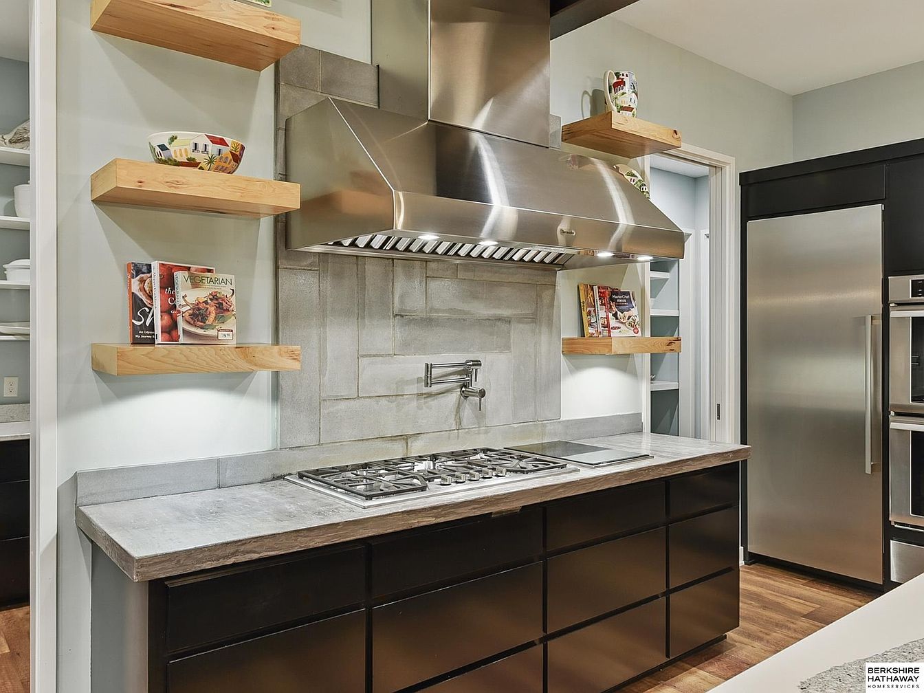 This kitchen features a sleek, modern design with a focus on functionality and clean lines. The dark cabinetry contrasts sharply with the muted, concrete-like countertop and backsplash, creating a contemporary industrial vibe. A large stainless steel range hood dominates the space above the gas cooktop, emphasizing a professional culinary style. Natural wood floating shelves add warmth and display colorful cookbooks and pottery, breaking the monochrome palette. The stainless steel refrigerator seamlessly integrates with the cabinetry, while warm wood flooring grounds the space. The overall atmosphere is minimalist yet inviting, combining utilitarian and natural elements effectively.