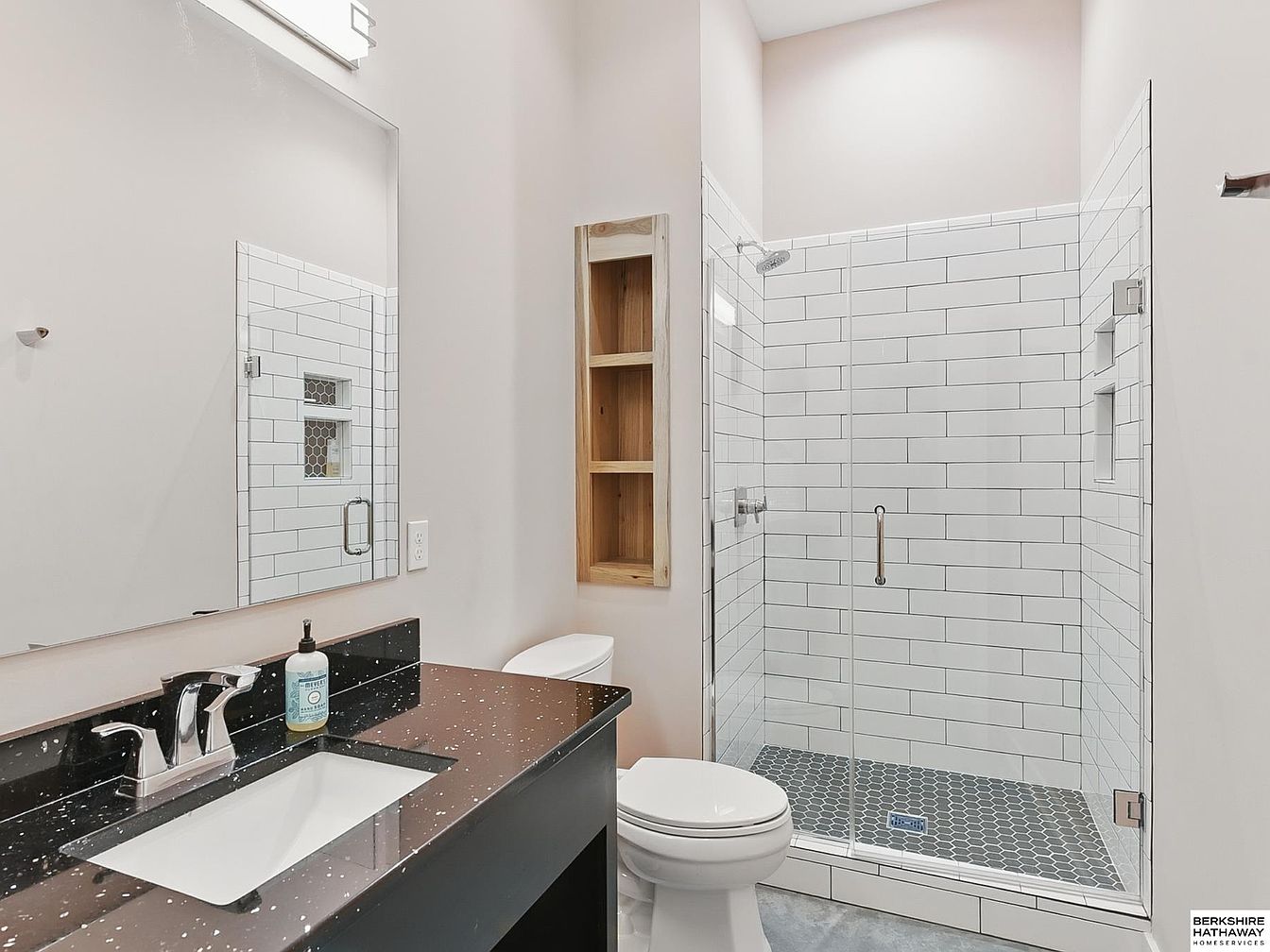 This bathroom showcases a contemporary design with a focus on clean lines and functionality. The shower features white subway tiles arranged in a horizontal brick pattern that extend halfway up the wall, contrasted by a dark hexagonal tile floor in the shower base. The glass shower door with minimalist hardware keeps the space light and open. Adjacent to the shower is a toilet, placed neatly next to a built-in vertical wooden shelving niche for storage or display. The vanity countertop is black with subtle reflective speckles, paired with a simple rectangular undermount sink and chrome faucet, complemented by a large frameless mirror above. Neutral wall colors and natural light enhance the fresh and modern feel of the space.