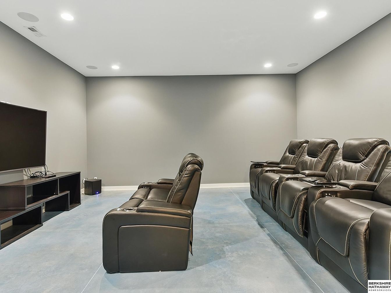 This dedicated home theater space features two rows of plush black leather recliner seats, designed for maximum comfort. The front row consists of two seats, while the back row offers four, all equipped with cup holders and reclining functions. The room has a minimalist, modern feel with smooth grey walls and soft overhead recessed lighting that evenly illuminates without distracting from screen viewing. The flooring is a cool-toned concrete finish, contributing to the contemporary aesthetic. A sleek black entertainment console holds the large flat-screen television and essential media equipment, highlighting streamlined functionality and comfort.