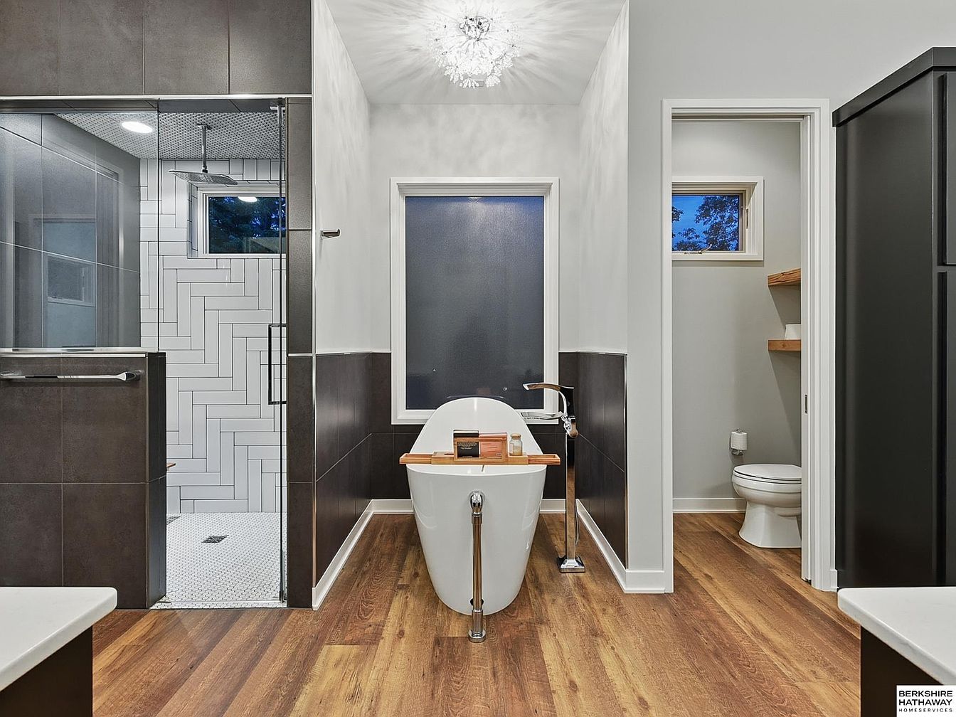 This spacious master bathroom features a sleek, contemporary design with a freestanding white bathtub centered beneath a large frosted window, offering privacy and soft natural light. The walls are divided with matte black tiles on the lower half, contrasting crisp white paint above, creating a sophisticated two-tone effect. To the left, a walk-in shower is enclosed by glass and showcases a stunning, geometric arrangement of white subway tiles paired with dark framing. The warm wood-look flooring adds a natural element, harmonizing with the wooden shelves and bath tray. A separate toilet area enhances functionality, all under modern lighting that adds an elegant sparkle above the tub.