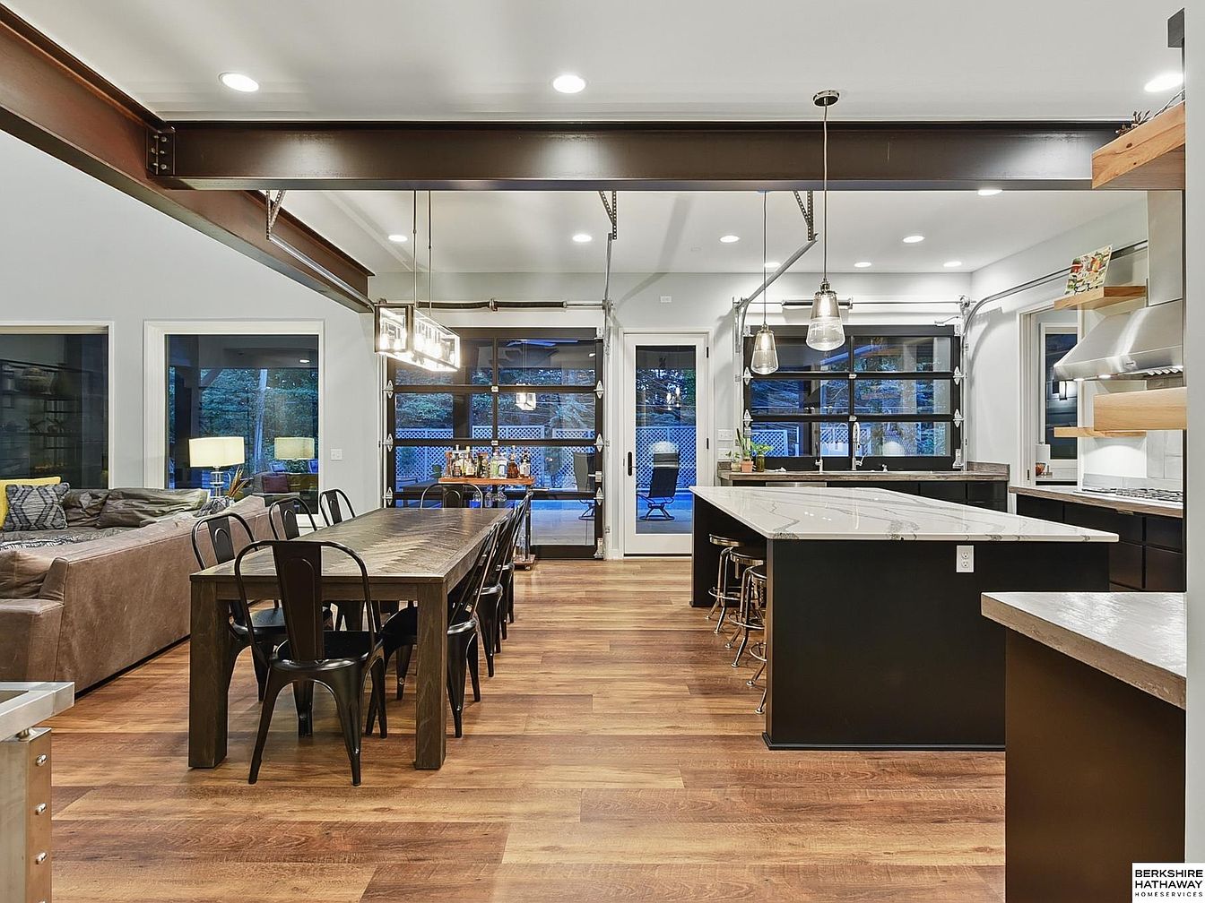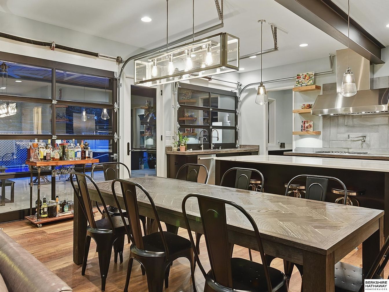 This spacious, modern kitchen flows seamlessly into a dining area, creating an inviting open-concept environment. The color palette focuses on warm wood flooring paired with sleek black cabinetry and metallic accents. A large kitchen island topped with a light-colored countertop offers ample prep space, complemented by two glass pendant lights overhead. The dining table, constructed from dark wood with a subtle herringbone pattern, is surrounded by black metal chairs enhancing the industrial-chic vibe. Expansive glass-paneled garage-style doors bring in natural light and connect the interior with an outdoor patio, perfect for entertaining. Decorative shelving flanks the stainless steel range hood, adding character and visual interest.