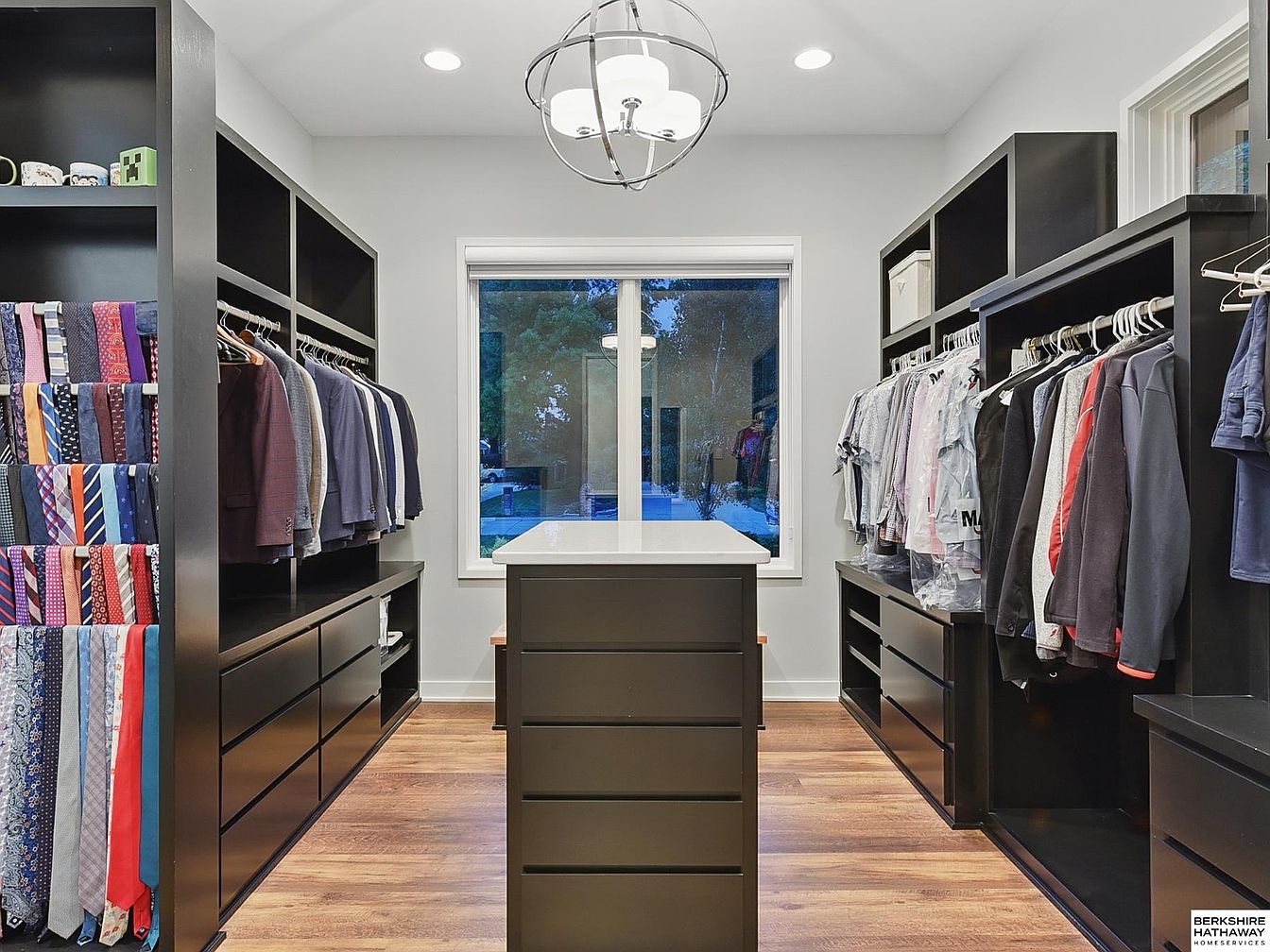 This walk-in closet features a streamlined and modern design with dark wood cabinetry extending along both walls, providing ample hanging space and drawers for organized storage. The cabinetry contrasts elegantly with the light gray walls and warm, natural wood flooring. At the center stands an island with additional drawers topped by a smooth, light surface, ideal for folding or laying out garments. A large window at the back allows natural light to brighten the space, complemented by a contemporary, globe-style light fixture overhead. The room combines functionality with a minimalistic yet sophisticated aesthetic.