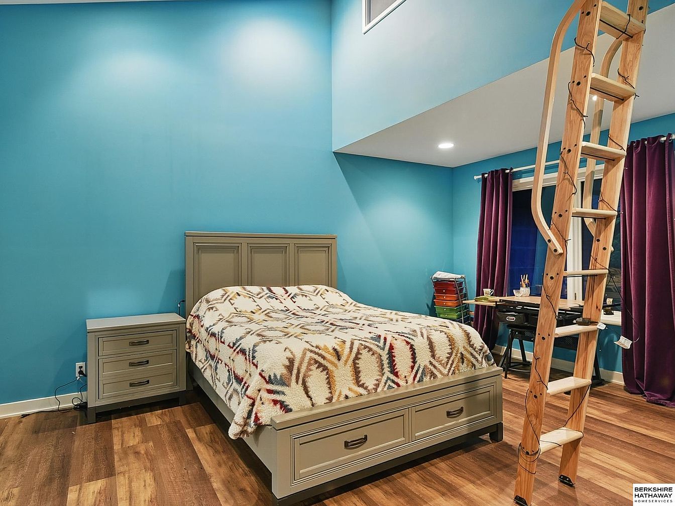 This bedroom features vibrant aqua-blue walls that create a calming yet invigorating atmosphere. The bed frame and matching nightstand are painted in a soft taupe color with classic paneling and dark metal hardware, lending a touch of rustic charm. A cozy, patterned blanket adds warmth and texture to the bed. The room’s flooring is composed of rich, medium-tone hardwood, enhancing the cozy ambiance. To the right, a natural wood ladder with string lights provides vertical access to a loft space above, suggesting clever use of multi-level living. Nearby, plum-colored curtains frame a window, complementing the color scheme while a practical desk area indicates a functional blend of rest and work space.