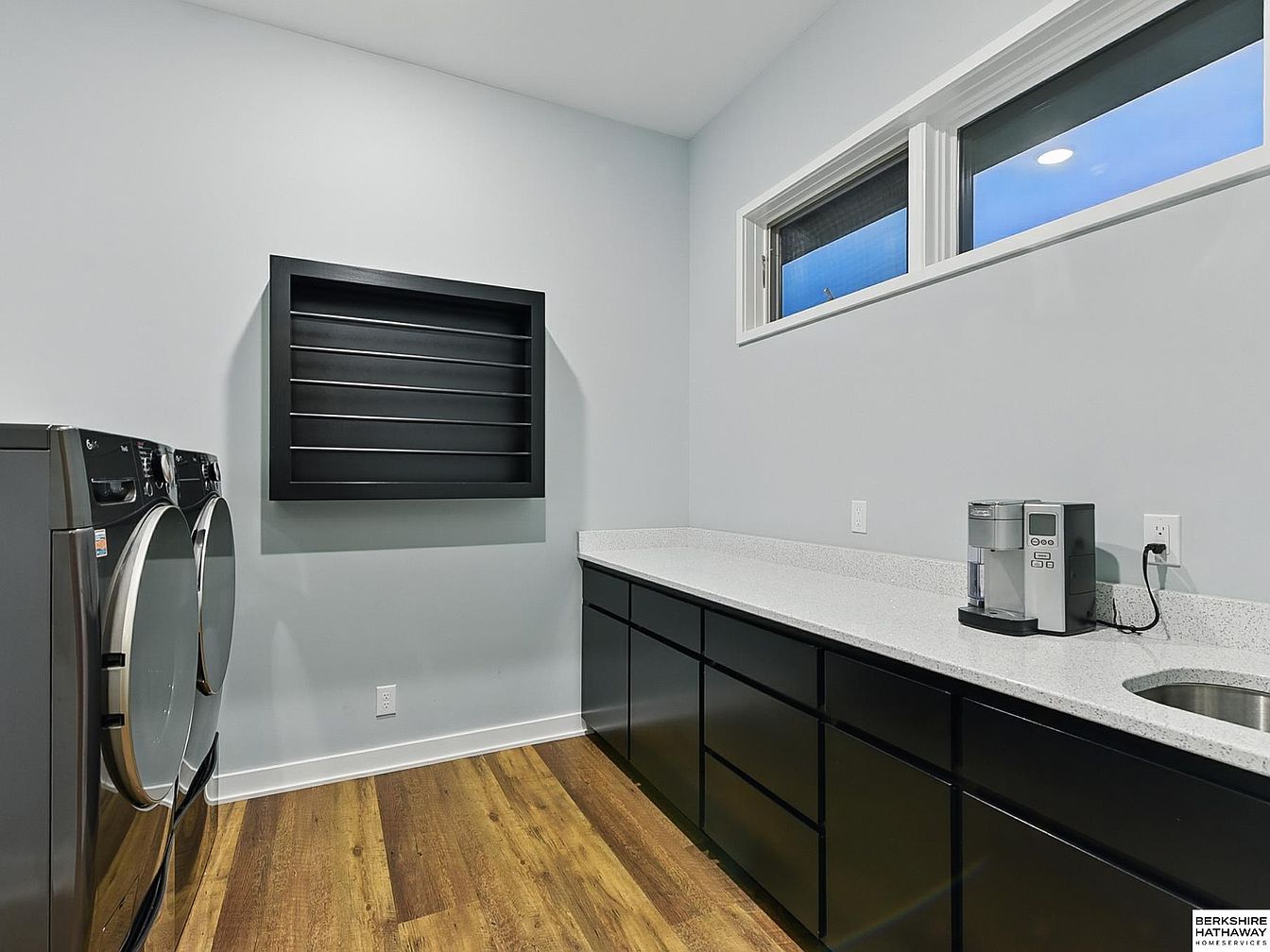 This laundry room features a modern and sleek design with a long stretch of white speckled quartz countertops atop rich black cabinetry providing ample storage and workspace. On the left, a front-loading washer and dryer in stainless steel stand side by side. The walls are painted a soft, light gray, enhancing the brightness of the room. Above the cabinets, a horizontal rectangular window allows natural light to flow in, further illuminating the space. The warm wood flooring adds a natural, cozy touch to the otherwise minimalist, functional layout, making chores more pleasant.