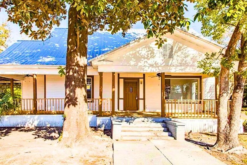 This beautifully renovated home features classic Southern architecture with a welcoming front porch framed by natural wood accents. The light gray siding and metal roof add a clean, modern feel while maintaining its timeless appeal. Mature trees, including a striking palm, offer shade and character to the front yard. Situated on a corner lot with a spacious walkway, this property is perfect for relaxing outdoors and enjoying neighborhood strolls.