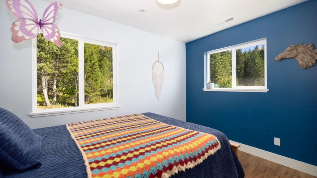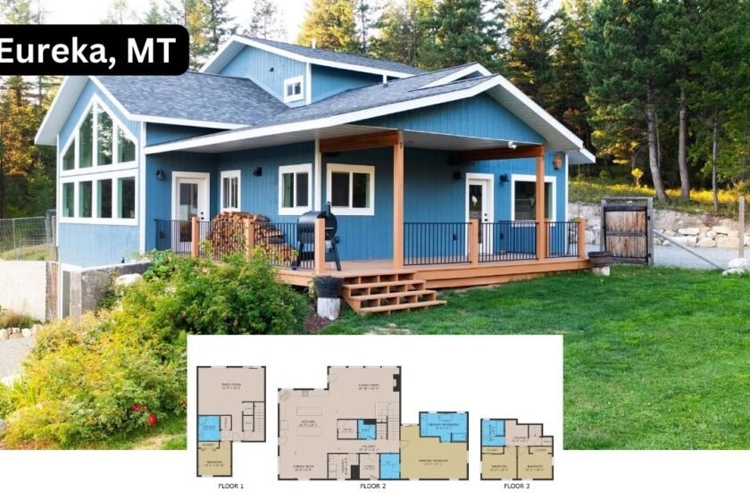 Surrounded by a expansive 20-acre property, this stunningly designed Eureka, Montana, home features panoramic views and a serene retreat. The rich blue hue, combined with the inviting wood trim, provides an interesting contrast to nature. Spacious A-frame windows shower the interior in natural lighting, and the covered porch gives way to a comfortable outdoor area where one can breathe in the mountain freshness. Inside, the open floor plan beautifully integrates the kitchen, dining, and living spaces, ideal for entertaining. Well-planned bedrooms and contemporary amenities provide comfort and sophistication. With beautiful views from all sides, this home is a real retreat in nature.