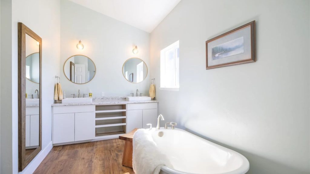 Soft natural light bathes this peaceful bathroom, adding to its airy and welcoming atmosphere. A freestanding tub, covered by a luxurious throw, is the ultimate place for relaxation. The double vanity, with its crisp white cabinetry and marble top, mixes modern simplicity with classic beauty. Rounding out the room, round mirrors in gold frames add a warmth of tone, reflecting the room’s understated elegance. A wood-framed floor-length mirror leans against the wall, creating depth and personality. The warm green walls, combined with rich wood floors, create a spa-like ambiance. From the vintage light fixtures to the framed landscape paintings, each element adds to the understated luxury of the space.